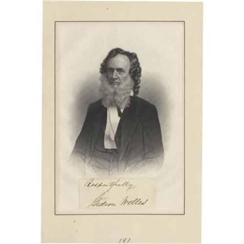 <B>Engraved Portrait of Lincoln's Secretary of the Navy, Gideon Welles Signed</B></I> “<I>Respectfully Gideon Welles</B></I>”. 6.25” x 9.5”, excised from a book and professionally mounted in a paper matt, signature affixed to portrait, in fine condition. Gideon Welles (1802-1878) was Secretary of the Navy during the Civil War period. He was also instrumental in the Navy's creation of the Medal of Honor. <BR><BR><b>Shipping:</b> Flat Material, Small (<a target="_blank" href="http://www.heritageauctions.com/common/shipping.php">view shipping information</a>)