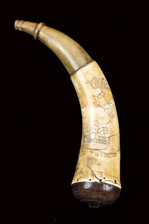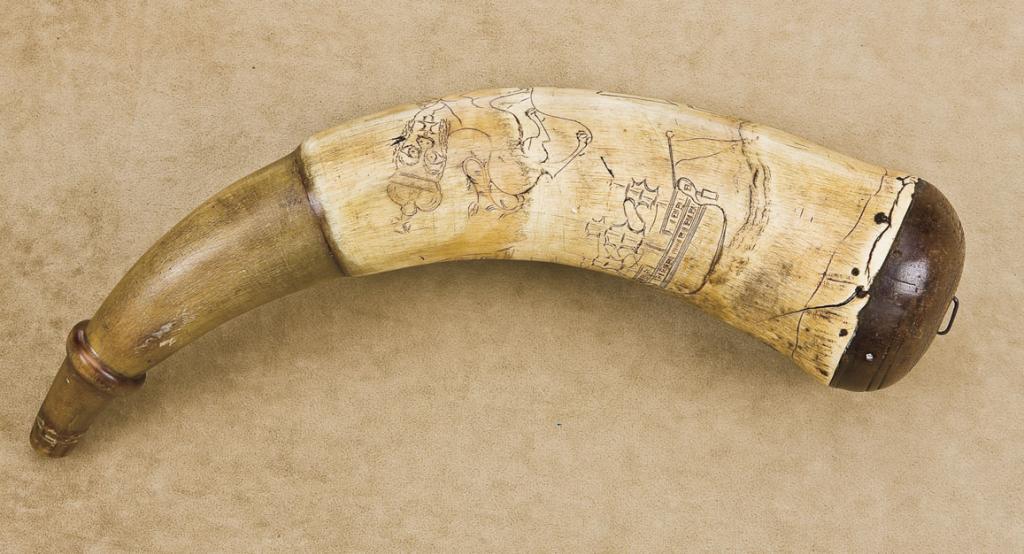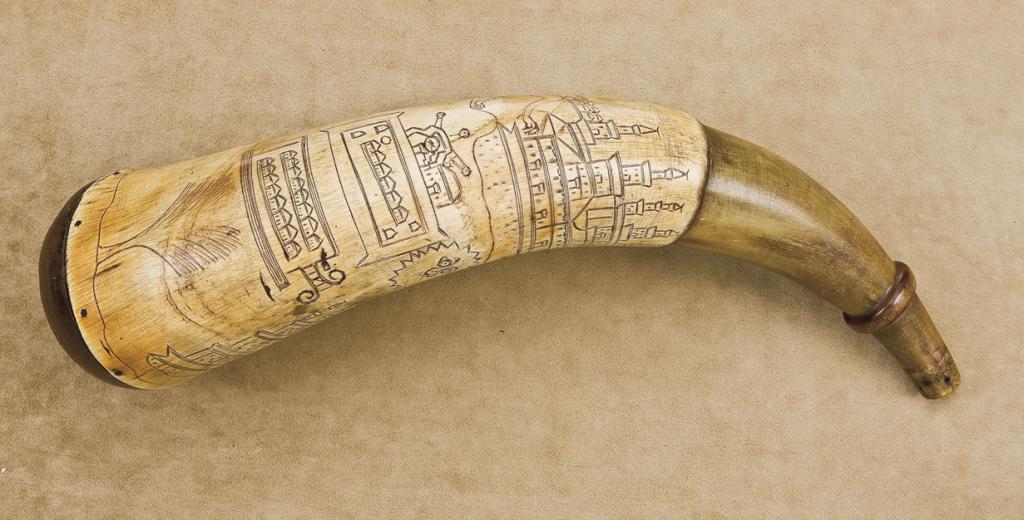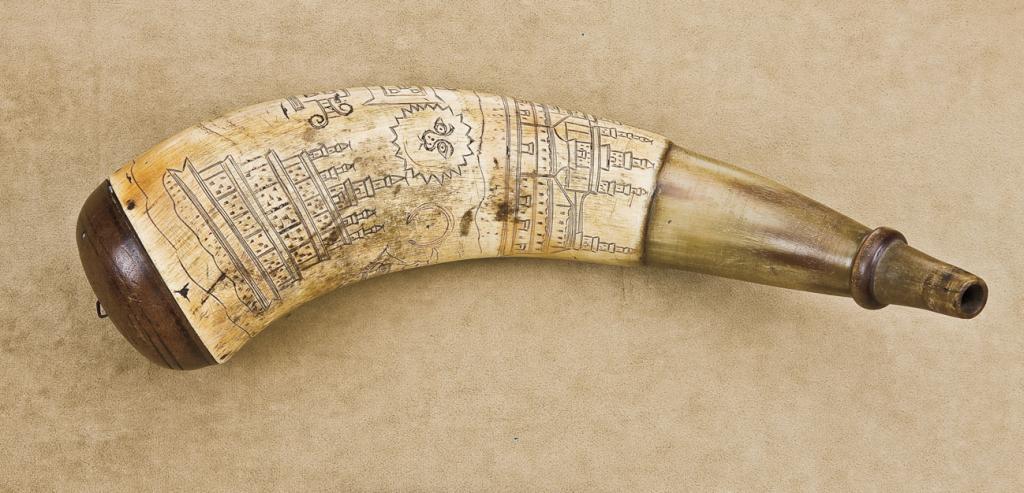 Engraved Powder Horn, undated, circa 1750’s-1770’s. There are some two dozen known examples of this unidentified engraver’s work to whom the cataloger years ago had given the title, “The Folky Artist”. And yes, the cataloger is aware that Mr. Webster does not at all recognize the word “folky”. Most often his horns carry no legends or dates. His subjects consist of very large buildings, England’s Great Seal or elements of it, a very large moth, the familiar hunter and his hound pursuing a deer, a sun-in-splendor with a comical human face, and feather-like trees to name but a few. This is not to say that all of these subjects appear on any single work but each has some of them as well as other motifs. The work is very naïve in nature, the facial features of both the human and animal figures as well as those of celestial bodies are generally whimsical. The subject horn has two very large buildings or a series of buildings, one along its lower border, the other along its upper, midway between these are two rectangular enclosures each with a series of small houses, or possibly barracks. The upper enclosure is shown with three cannon mounted in a bastion. To the left of the large, upper building there appears a crowned lion and beneath him a three masted ship. Additionally, there is a comical sun-in-splendor and one of this artisan’s “feathery” trees. The earliest dated horn – dated in the hand of its maker- which the cataloger has examined carried the date of “1756”. This was formerly in the notable collection of author George C. Neumann and now reposing in the federal museum at Valley Forge National P{ark, Valley Forge, Pennsylvania; 13” overall on the outside curve excluding the original hardwood buttplug, 2-5/8” diameter. The plug is high domed and incised with a series of concentric circles, the original, iron strap staple remains intact. The dyed-yellow color has a nice patination with an area of darkening which is smooth and without the least bit of roughage. There is a 2” area of tight and very old fine line cracking which runs along the rim of the base, to the immediate left of this old 1-1/4” crack extending upward. Neither of these are really offensive and are common occurrences especially in that area, they do not impair any engraving. The neck, 5-1/4” has a single stout ring, the spout was apparently once wrapped with cord to secure four fine line cracks which extend downward each about ¾”. Description by Walter O’ Connor. Est.: $3,000-$6,000.