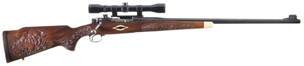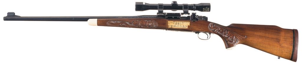 Engraved Pre-64 Winchester Model 70 Bolt Action Rifle in .375 H&H Magnum with Scope and Carved Stock