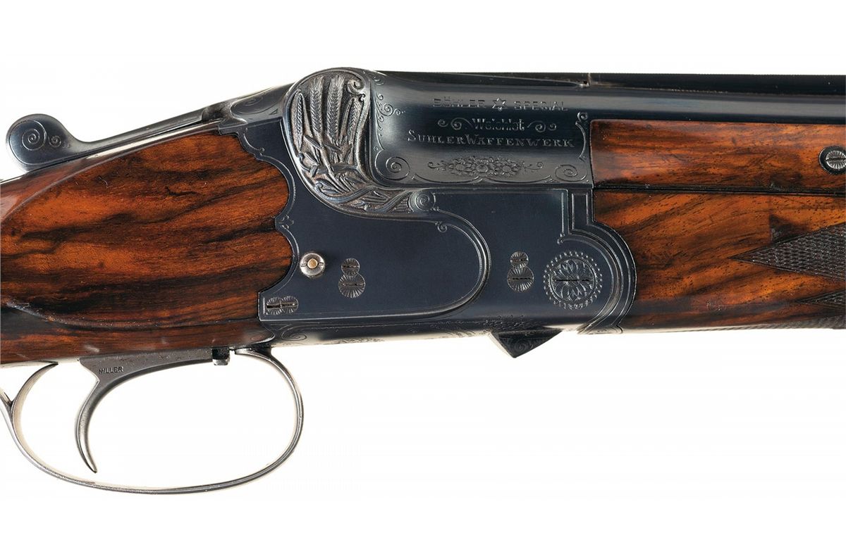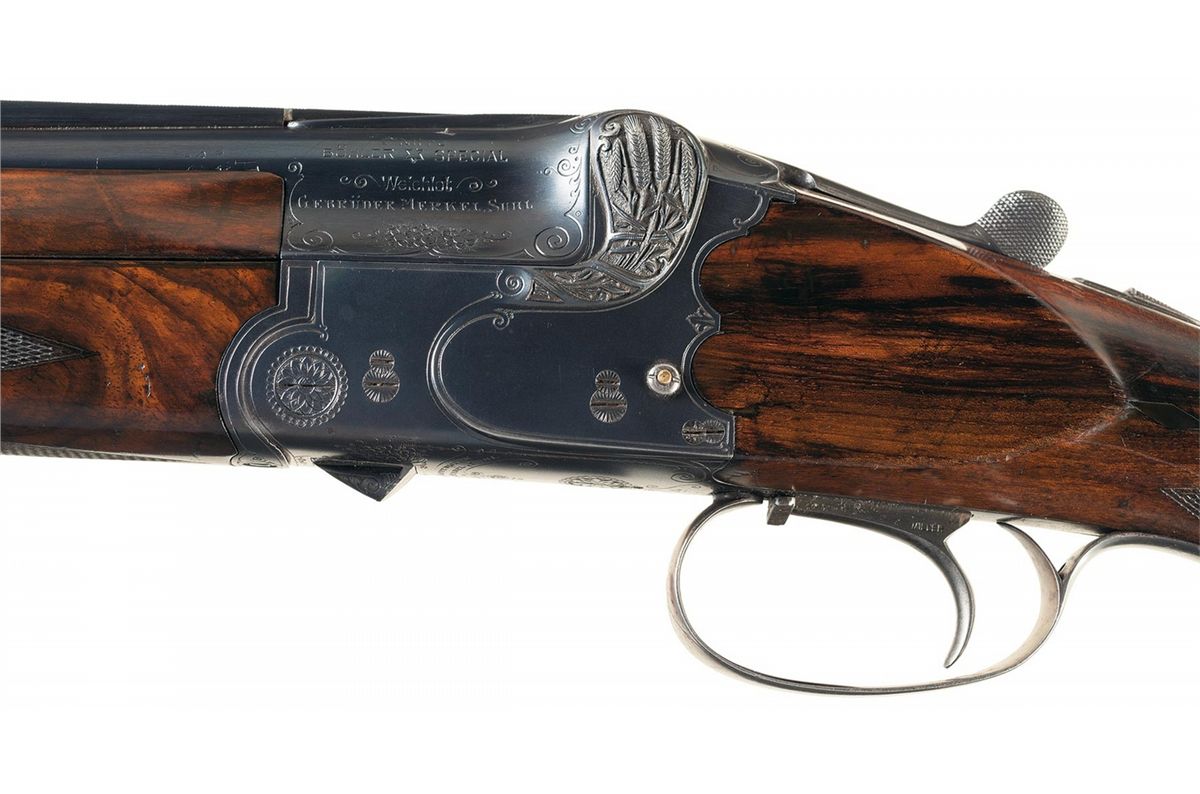 This example has deep relief engraving on the bolsters showing wheat stalks and was manufactured in April of 1928. The screw heads and hinge pin ends are engraved with star or floral motifs. The underside of the receiver and sides of the barrel at the breech have flourishes of rose bouquet engraving. The barrels have a brass bead front sight, a white mid bead sight, are choked improved cylinder/modified and have 2 3/4 inch chambers with ejectors. There is a Miller single trigger installed. Mounted on a nicely figured multi-point checkered walnut forearm with horn insert and a round knob pistol grip stock with contrasting initial oval and a Kick-Eez recoil pad. Length of pull is 13 1/2 inches.