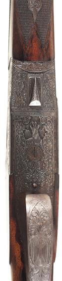Fine as modified. (Stock shortened) The barrels have 50% blue with the balance a brown patina with scattered minor oxidation and more of dark original blue finish present in protected areas of the center rib. The action has a smooth dark grayish brown patina with strong original case colors on the top. The upper tang retains most of the original vivid case colors and all of the gold inlay on the "S". The trigger guard has a smooth dark gray patina on the outer surface and most of the original case colors on the inside surface. The slightly shortened wood is also very good with a minor 1 inch crack on the left flat, and overall some minor dents and dings. The buttplate is a bit ill-fitting at the heel and there is some minor chipping on the toe. The engraving is crisp. Mechanically fine.