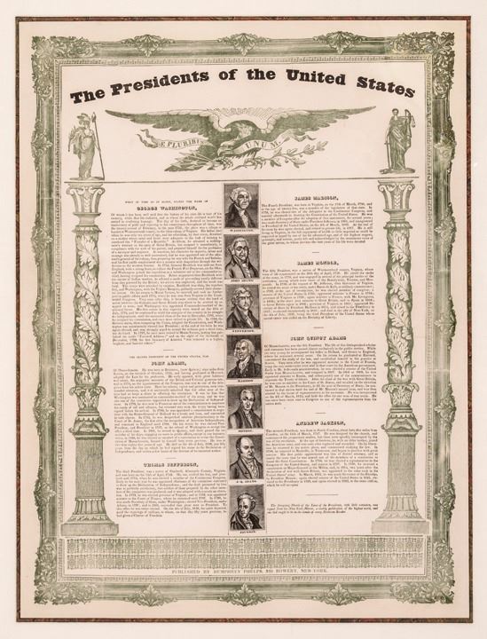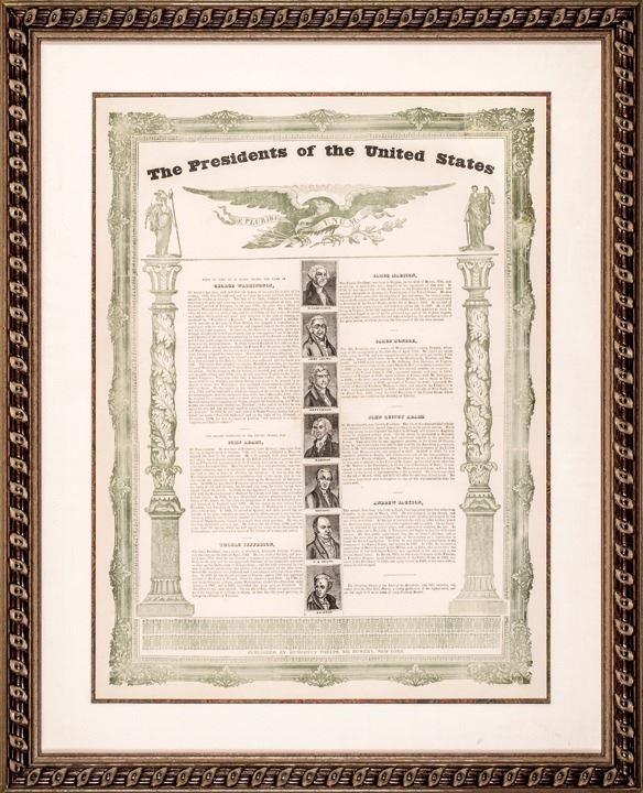 c. 1834, Graphic Presidential Broadside, titled "The Presidents of the United States", 25.25” x 19” (by sight), double matted and framed to 33.5” x 27”. Printed in a lovely medium green and black, published by “Humphrey Fields, 338 Bowery, New York.” It is illustrated with woodcut portraits of all the Presidents from George Washington to Andrew Jackson, along with brief biographies of each. A patriotic American Eagle with wings spread wide appears above, flanked by the Goddesses of “Liberty” and “Justice.” The final paragraph reads: “The foregoing Sketch of the Lives of the Presidents, with little variation, was copied from the New-York Mirror, a weekly publication of the highest merit, and one that ought to be in the hands of every American Reader.” Woodcuts of the Presidents are all sharp, crisp and clear. Highly attractive, bright and clean, ready for display. The first of this type was have offered.