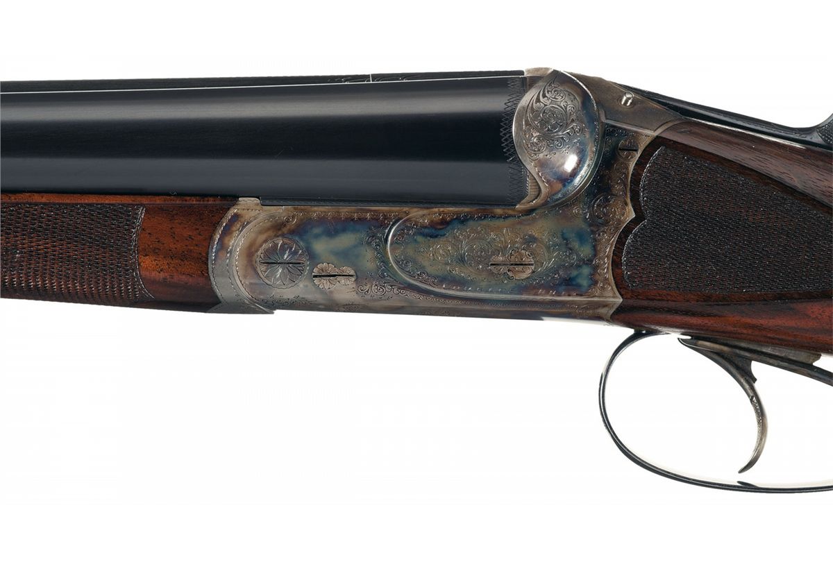 Condition: Professionally refinished (barrels), 99% blue finish remains on the barrels, break lever and trigger guard/lower tang. The receiver retains 85% of the vivid case colors with some wear on the forearm hardware, top tang, fences and bottom of the receiver. The wood is excellent with some scattered minor marks and sharp checkering.