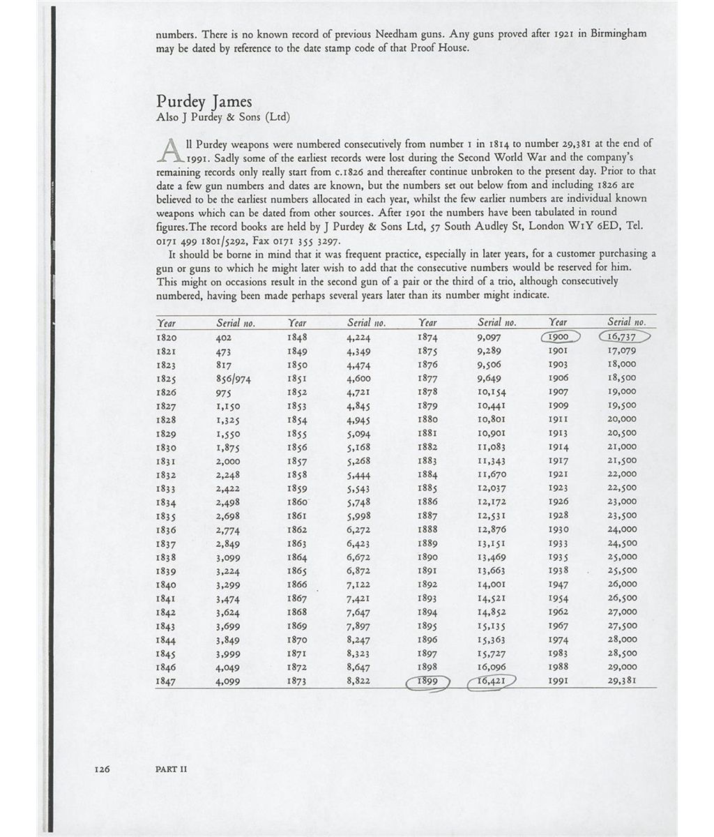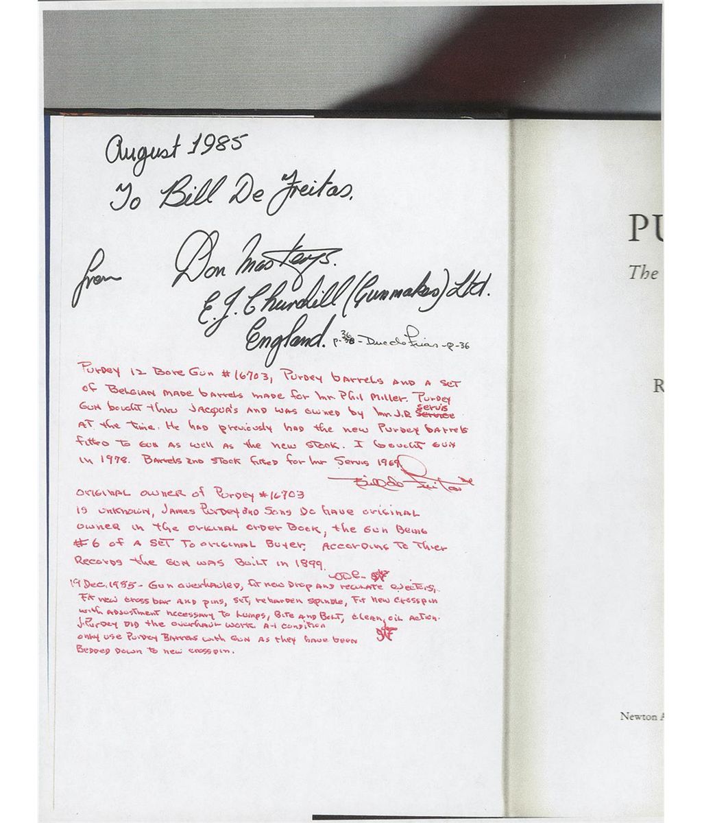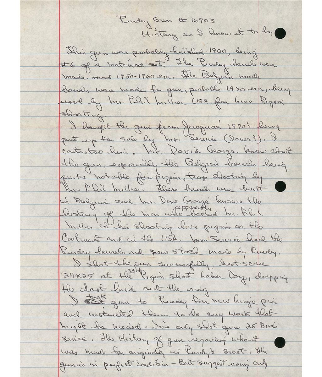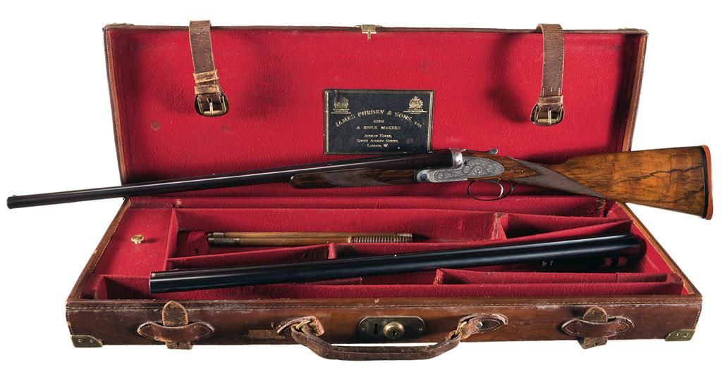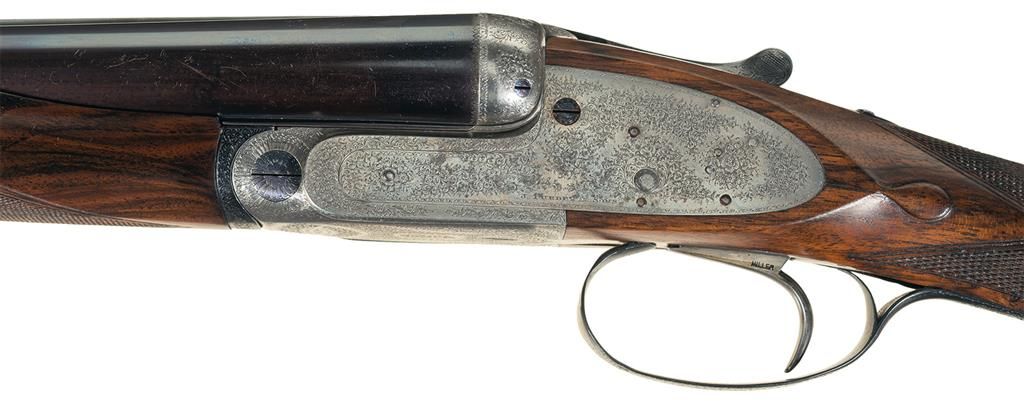 Manufactured circa 1899. The frame, side locks, break lever, forearm hardware and trigger guard are engraved with fine English scroll and rosettes. Each lock is marked "J. PURDEY & SONS" and the underside of the frame is marked "PURDEY'S/PATENT". The shotgun comes with two barrel sets. Both are 28 inches in length, and finished blue with double ivory bead sights and concave solid matte ribs. One set of barrels was manufactured in Belgium around 1920 by Phil Miller for live pigeon shooting. It has 2 3/4 inch chambers, choked modified/full with ejectors. The barrels are numbered to the gun and the flats are marked "DAGUN" and with various Belgium proofmarks. The second set of barrels and stock were made by Purdey circa 1950-1960. This set is chambered 2 3/4 inches, choked full/skeet with ejectors. The top of the left barrel near the breech is marked "J. PURDEY & SONS" and "AUDLEY HOUSE. SOUTH AUDLEY STREET. LONDON, ENGLAND." The barrels are numbered to the gun and the barrel flats are marked with the tonnage marking and nitro proofed. The water table is marked with British and Belgium proofmarks. The inside of the forearm hardware is numbered to the gun and marked "6". Consignor noted indicate that the Purdey records indicate this was originally number 6 of a matched set, which in writer's opinion is what the number 6 on the forearm designates. Blue barrels, break lever and trigger guard, coin finished frame and locks, single Miller trigger, cocking indicators, tang mounted automatic safety and mounted with a nicely figured deluxe multi-point checkered walnut semi-beaver tail forearm with engraved hardware and straight grip stock with teardrop flats, solid recoil pad with inscribed gold initial oval. The shotgun comes with a hard leather case with leather straps and brass corner protectors and red felt lining. There is a leather James Purdey & Sons label affixed to the inside of the lid. In the case is a two-piece wooden cleaning rod, a screwdriver and extra internal parts. The shotgun also comes with a brief history of the shotgun, invoices and letters reference the refurbishment, a copy of the book "London Gunmakers" by Nigel Brown, signed by the author and Don Masters of Churchill Gunmakers and a copy of the book "Purdey's The Guns And The Family" by Richard Beaumont signed by Don Masters of Churchill Gunmakers. 2 3/4 inch chambers, bore diameter: R- .737 L- .732, bore constriction: R- .012 L- .036, min. bbl thickness: R- .032 L- .028, length of pull: 13 7/8 inches, drop at comb: 1 7/16 inches, drop at heel: 1 9/16 inches, cast-off: 1/4 inches, weight: 7lbs 0oz. Belgian barrels: 2 3/4 inch chambers, bore diameter: R- .730 L- .727, bore constriction: R- .020 L- .037, min. bbl thickness: R- .030 L- .033.