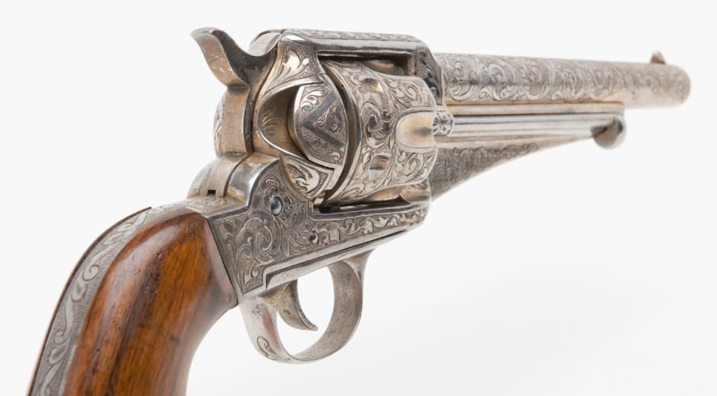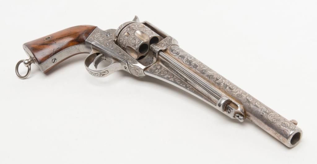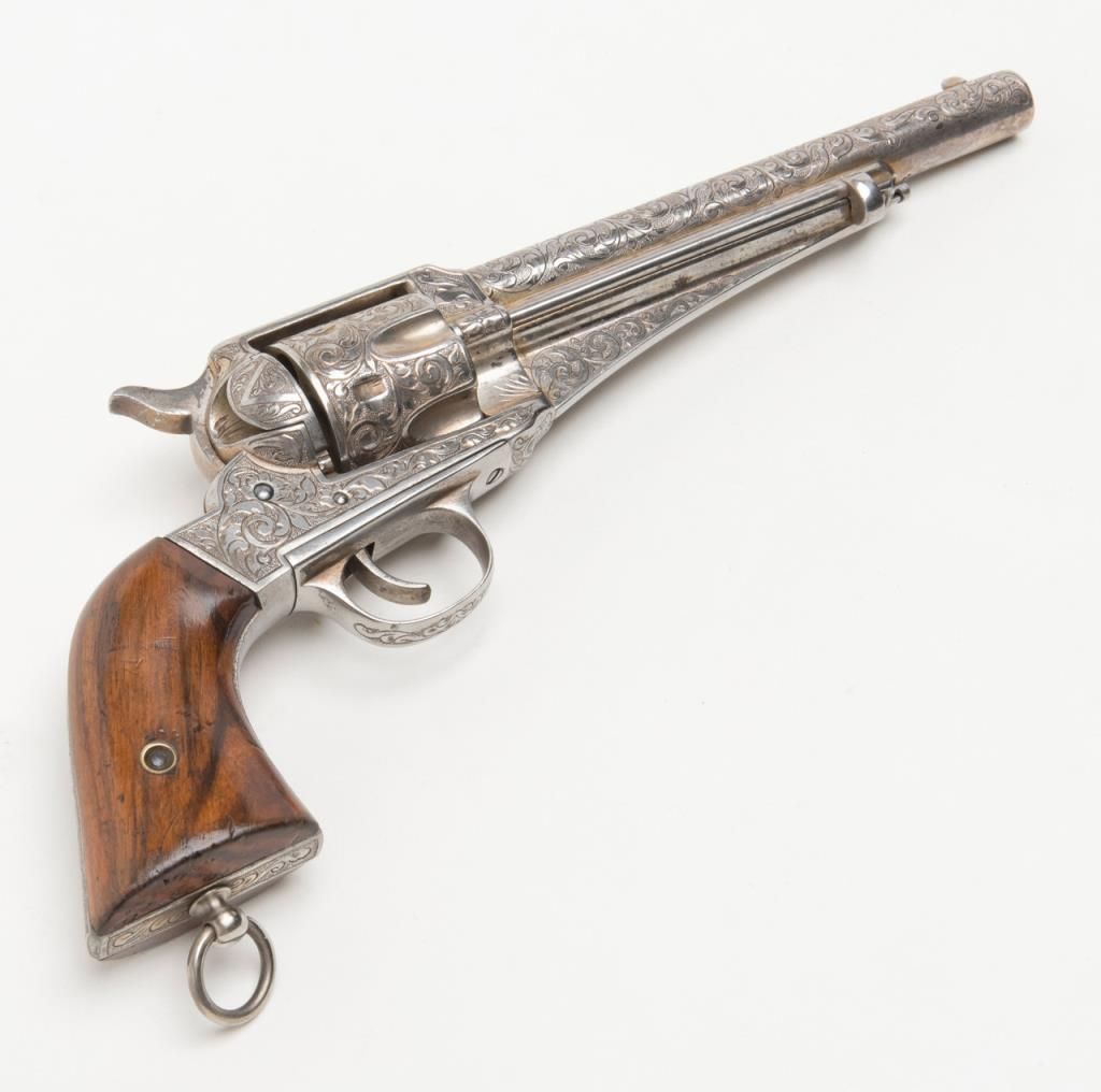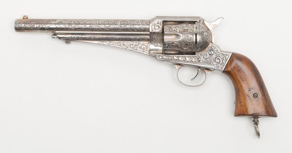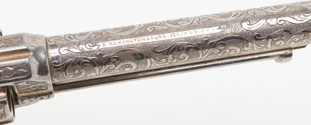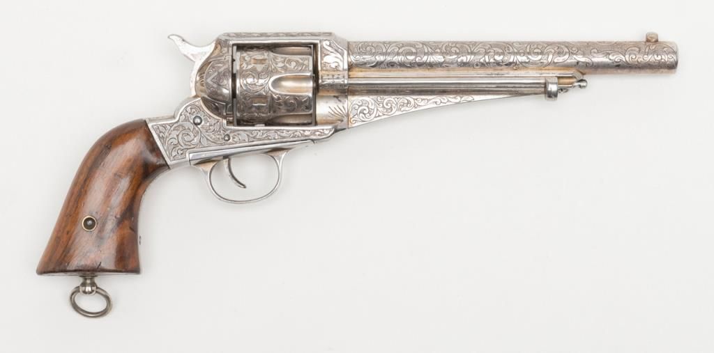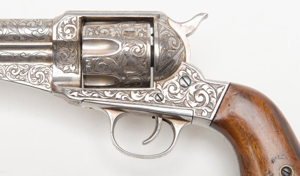 Engraved Remington Model 1875 Single Action Army revolver, .44 cal., 7-1/2” round barrel, nickel finish, wood grips, lanyard ring, #228. The gun is in overall very good to fine condition showing extensive scroll engraving over the frame,cylinder, barrel, ejector housing, trigger guard and backstrap; crisp action, sharp markings, very good bore; grips are also very good with some old mars and scratches from storage. The Model 1875 was also known as the Improved Army or FrontierArmy and was Remington’s attempt at competing with Colt’s single Action Army; made between 1875 and 1889. (Antique). Est.: $3,500-$7,000.