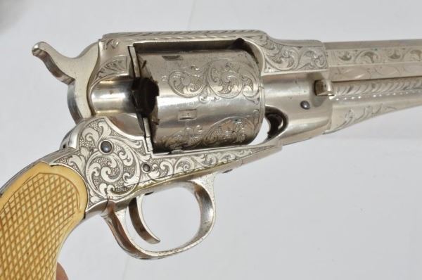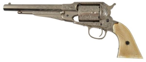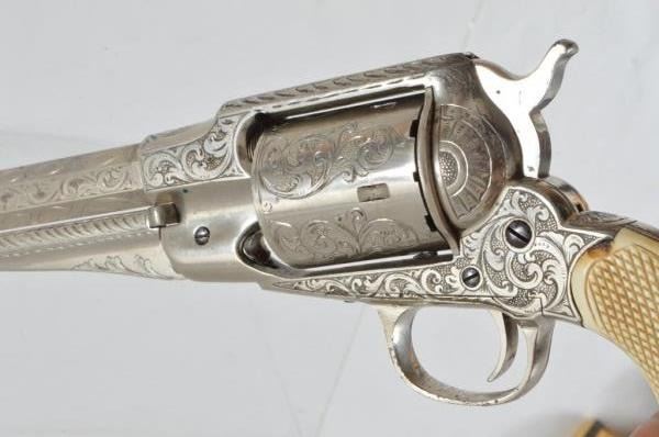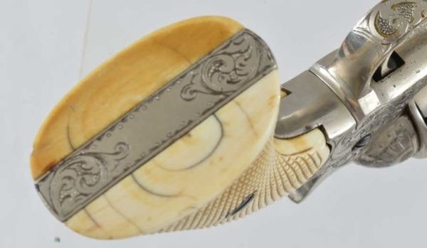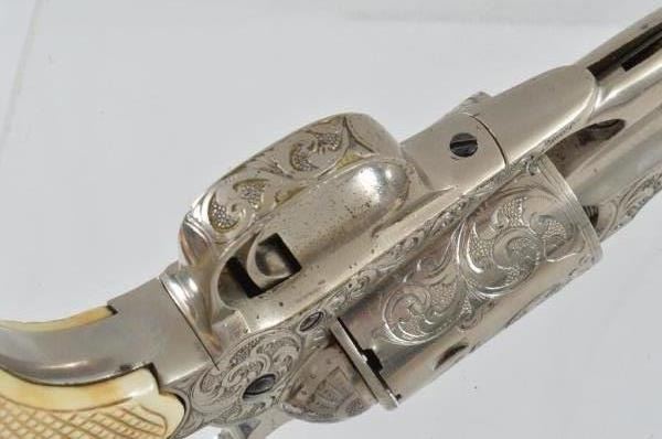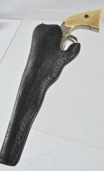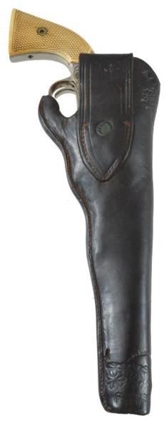 Serial no. 147170 .44 rimfire in excellent working condition retaining 95% of original nickel finish. 8" barrel with clear address. with period correct California pattern open top holster with floral stamp embellishments. Supple in good condition.
