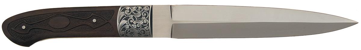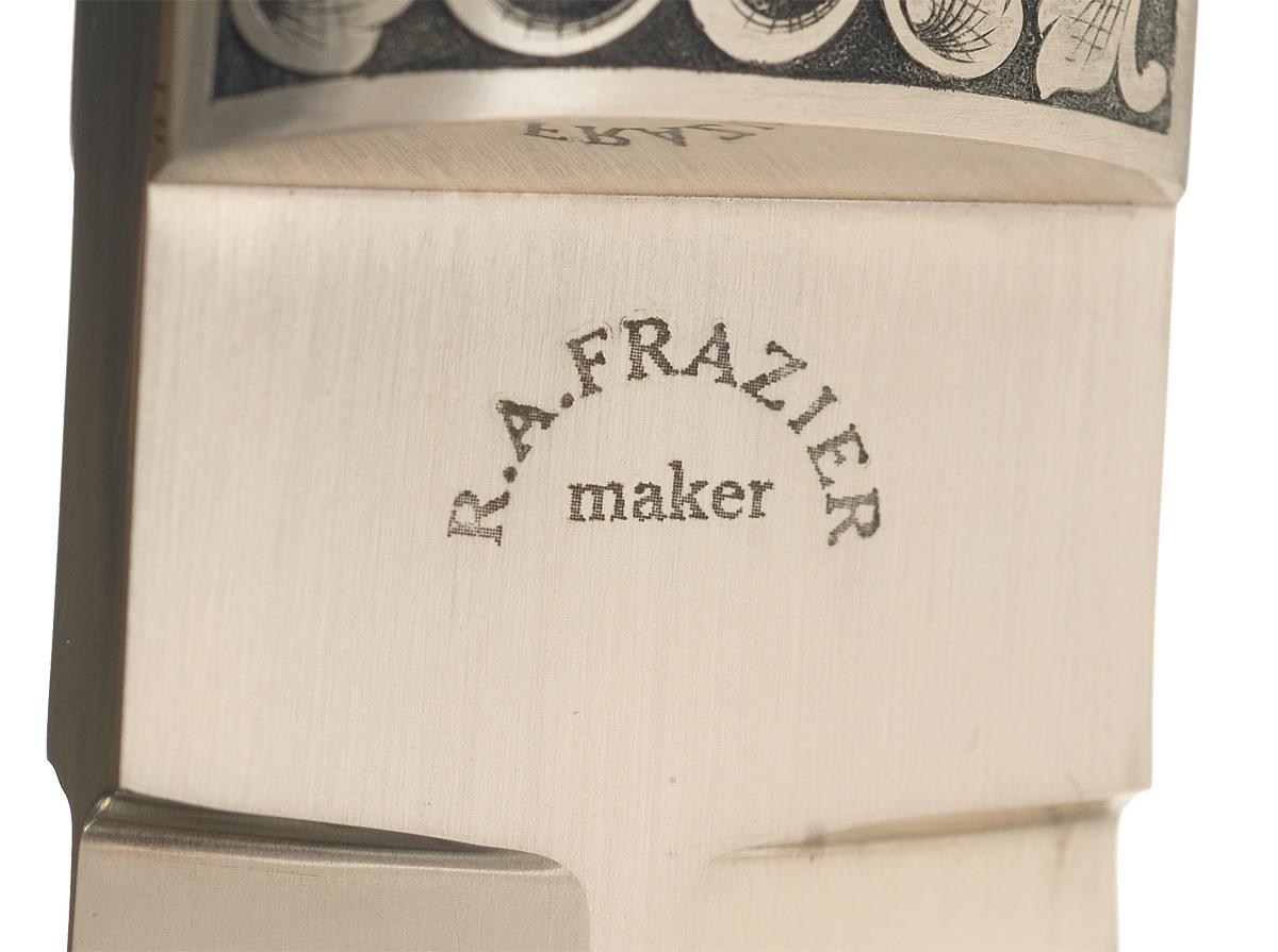 Ronald A. Frazier has been an award winning member of the Knifemakers' Guild for over 30 years and is best known for quality art knives. This Frazier knife has a 7 1/2 inch double edged blade marked "R.A. FRAZIER / maker". The bolster has a floral scroll engraving on a black antiqued punch dot background. The handle scales are a nicely figured textured hardwood with two rivets. OAL: 12 7/8"