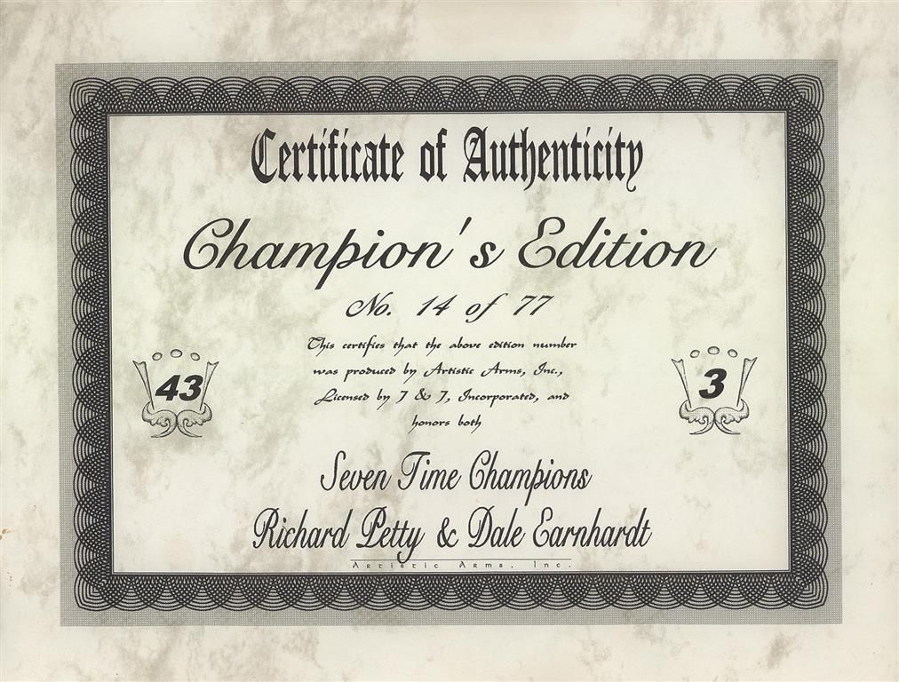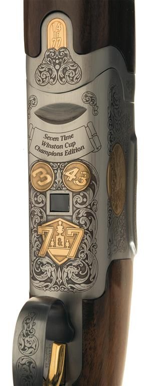 Manufactured in 1995, this shotgun is a limited edition of only 77 manufactured, commemorating the two 7 time Winston Cup Champions Richard "The King" Petty and Dale "The Intimidator" Earnhardt. Standard markings and features of the model and the commemorative. Threaded for choke tubes with skeet/skeet installed and 3 inch chambers with ejectors. Length of pull is 14 1/8 inches. Accompanied by a Certificate Of Authenticity that indicates this shotgun is number 14 of 77 issued by Artistic Arms, Inc. Complete with three extra choke tubes, choke tube wrench, two signed autograph cards and a leather covered takedown case