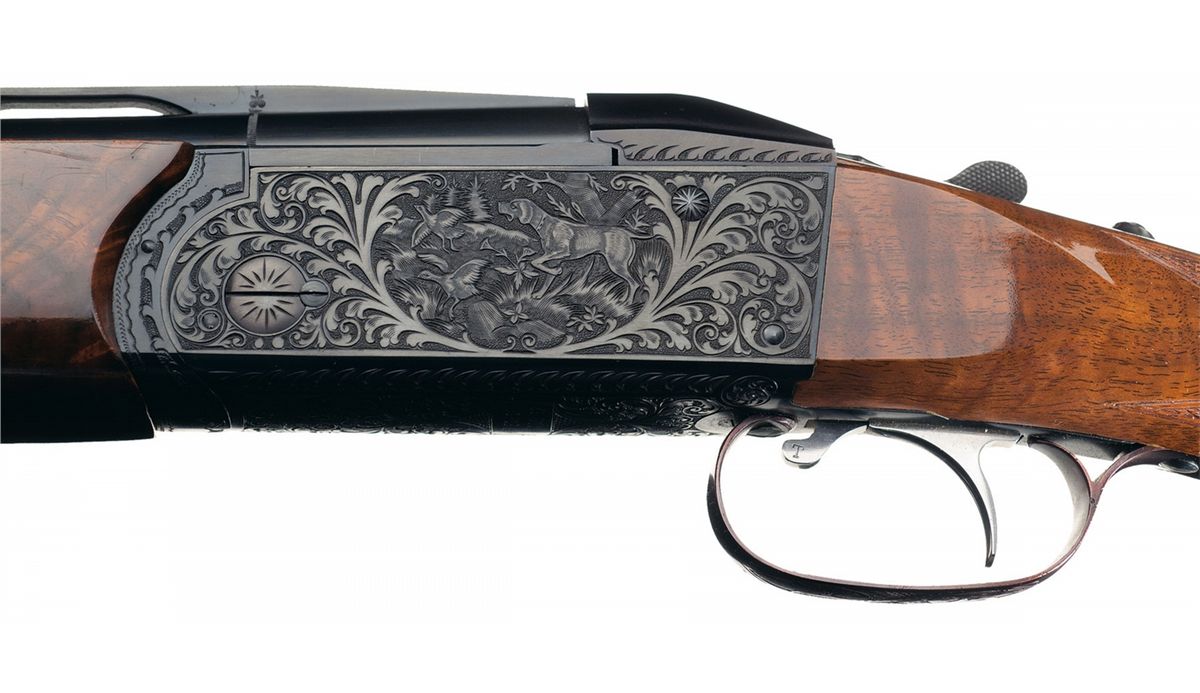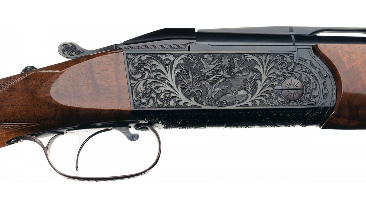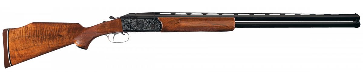 Introduced in the 1950's and discontinued in 1980. Dual bead sights on a matte vent rib, 2 3/4 inch chambers, chokes marked "F" for full and "IM" for improved modified with ejectors. The blued action has full coverage scroll engraving with woodland scenes on both sides and "KRIEGHOFF/MODEL 32" on the bottom. The scene on the left depicts a dog on point with two quail in flight and the right depicts three ducks beginning flight. The upper right side of the barrel is marked "MADE FOR EUROPA CORPORATION MIAMI FLORIDA" and the left side is marked "H KRIEGHOFF K.G. ULM GERMANY/MODEL 32- 12GA/BOHLER - LAUFSTAHL". Tang mounted safety and barrel selector in front of trigger. Mounted with a nicely figured, finely checkered deluxe walnut forearm with engraved hardware and a checkered pistol grip stock with raised comb and a solid Pachmayr White Line recoil pad. The length of pull is 14 3/4 inches.