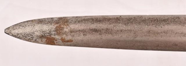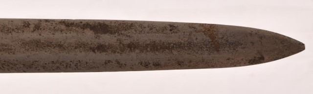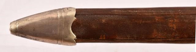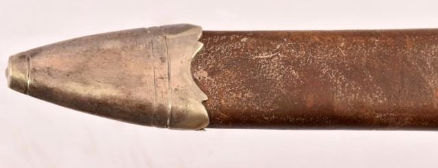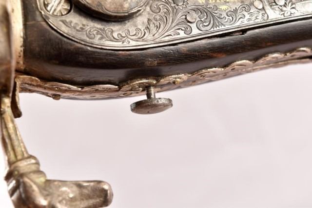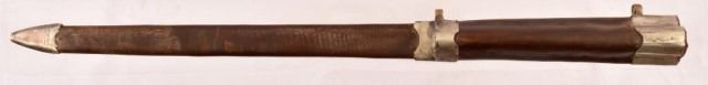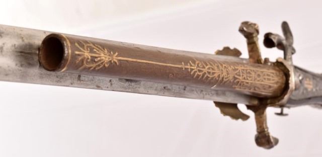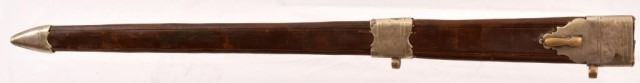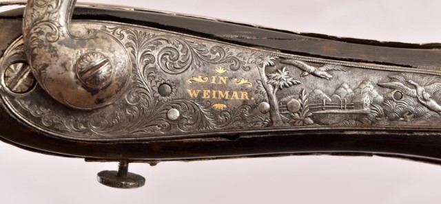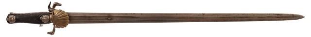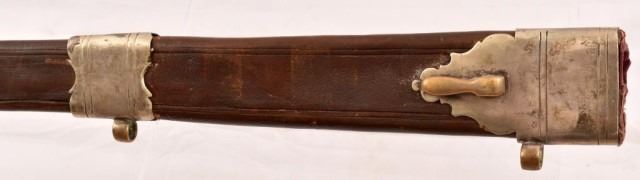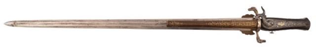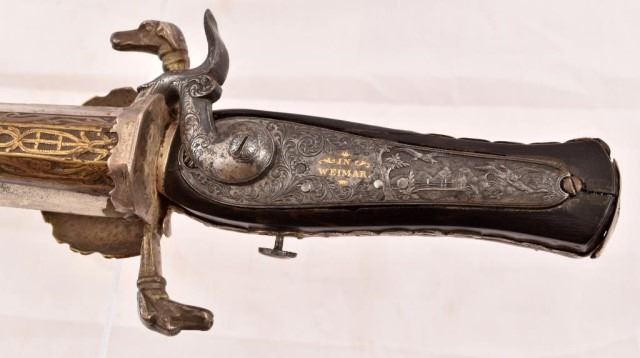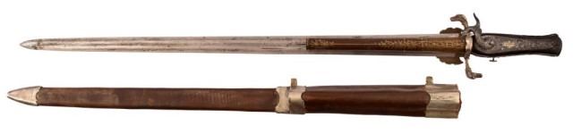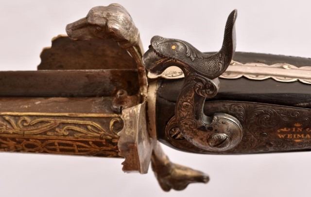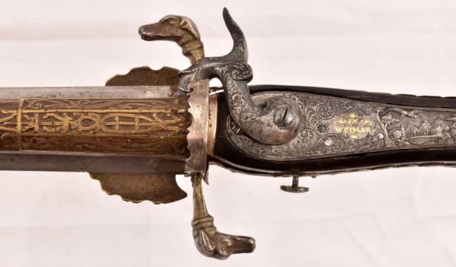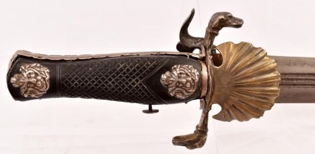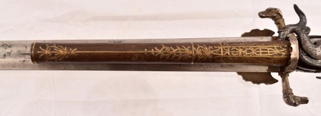 Hammer engraved with fish head, dog head hand guards. Hammer plate engraved with hunting dog scene and gold inlay. 28" blade length, 33.75" overall.