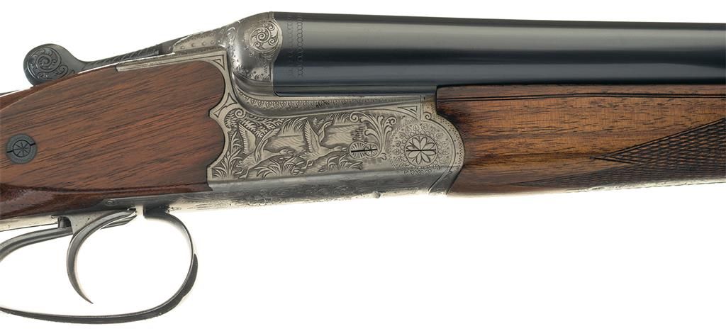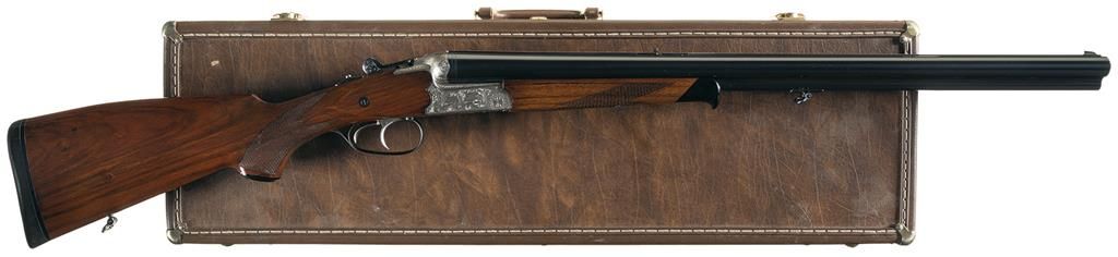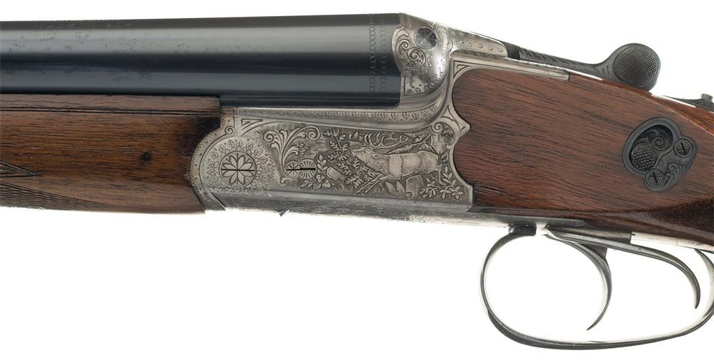 Blade front sight and folding rear sight on the solid matte rib. The top rear of the right barrel is marked "SPECIAL-GEWEHRLAUFSTAHL" and "SIMSON SUHL/MADE IN GDR" on the opposite side. The top barrels are 12 gauge, chambered for 2 3/4 inch shells, choked full/extra full with an extractor. The bottom barrel is 9.3x74 mm. The underside breech end of the barrels are marked with various German proofmarks, as well as the caliber and gauge designations. There is a sling swivel mounted on the underside of the bottom barrel. The scallop box lock action is nicely engraved with a wooded scene of a elk on the left side and two ducks in a marsh scene on the right side. The fences, underside of the action, trigger guard and forearm hardware have a scroll design. The underside of the action is also marked with the Suhl logo. Double triggers with adjustable forward set trigger, Greener safety, tang mounted safety/selector and mounted with a multi-point checkered walnut forearm with ebony forend and pistol grip stock with horn grip cap, cheek piece, solid recoil pad and sling swivel. Comes with a naugahyde case with fleece lining and three snap caps.