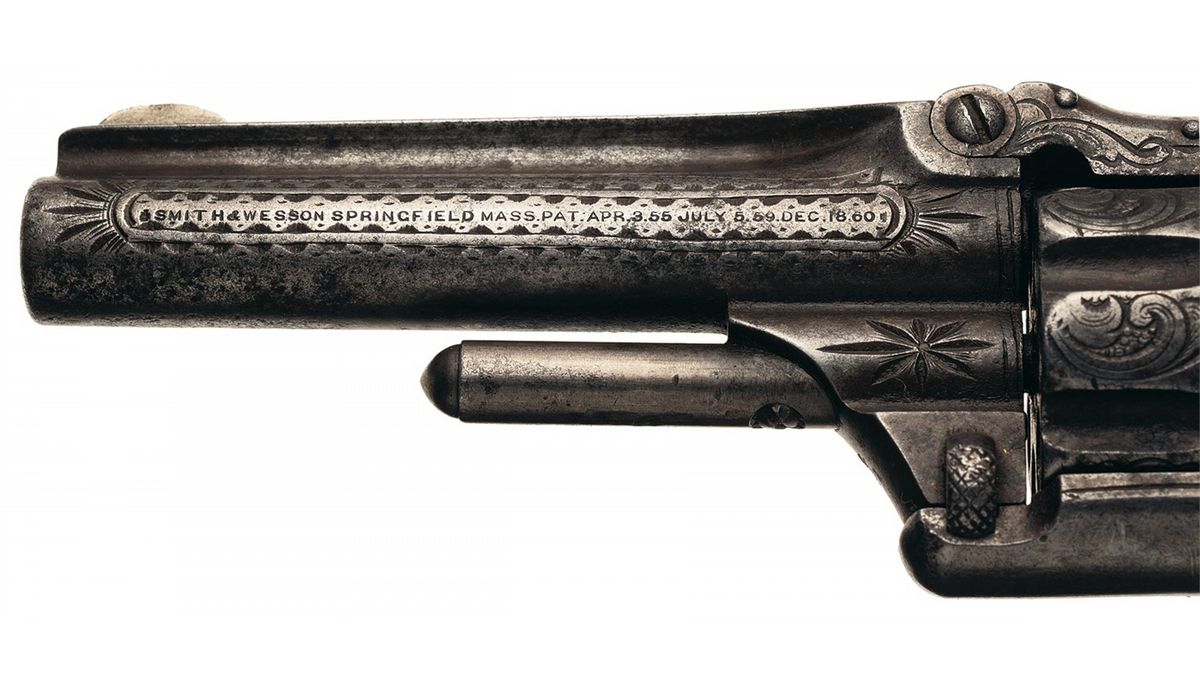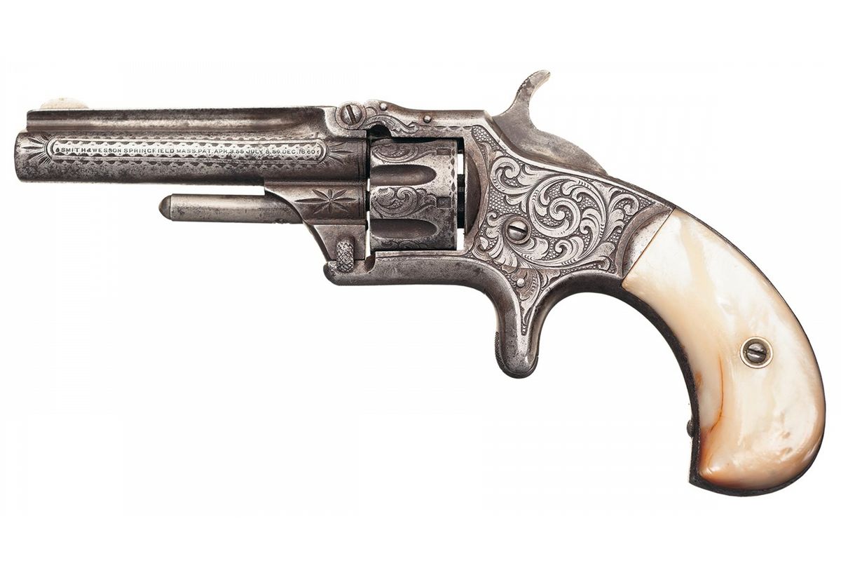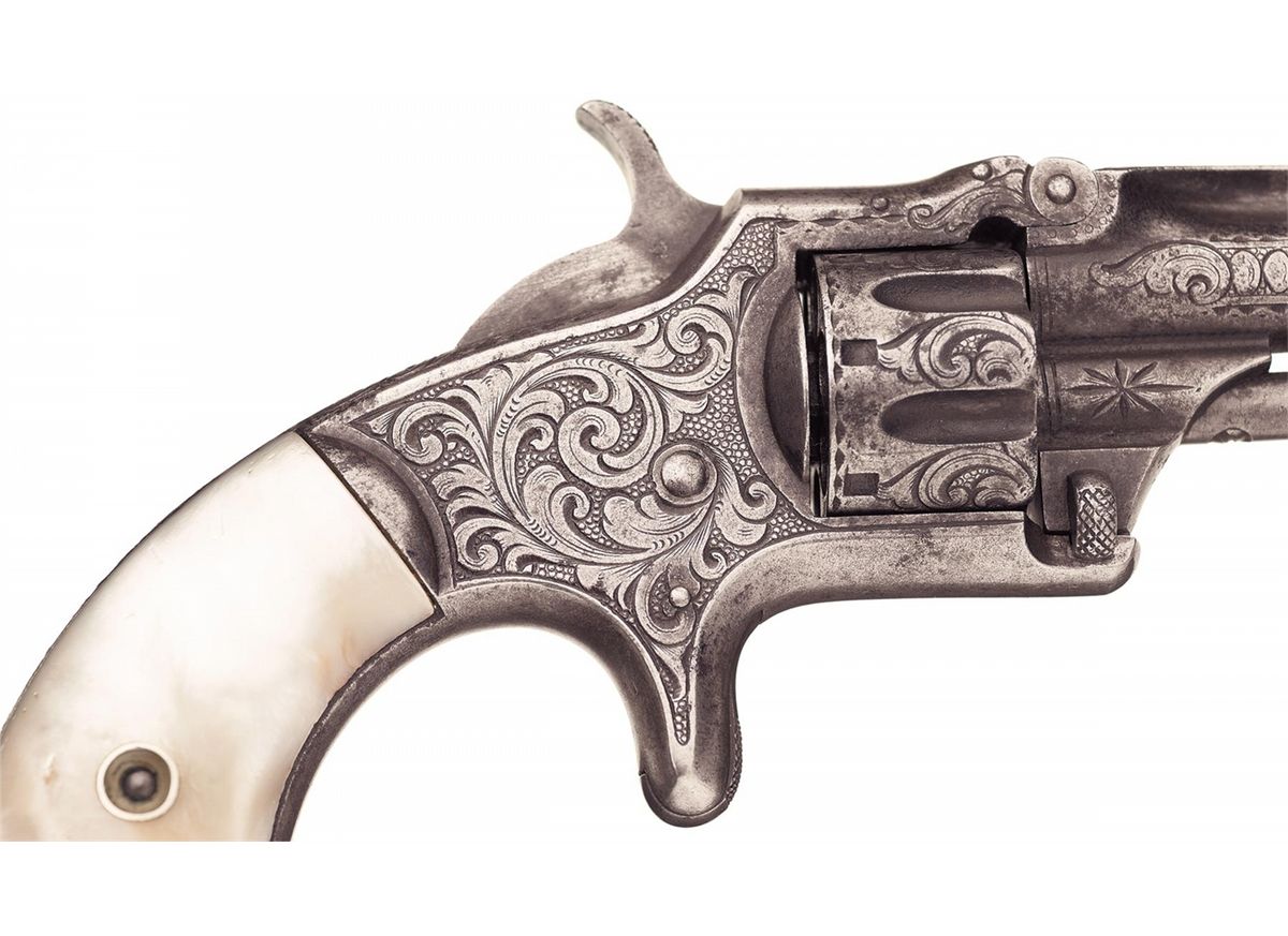 Manufactured circa 1868 to 1881. This example of a Model 1 3rd Issue revolver features 70% coverage of New York Style engraving with fine punch dot background and the rare short barrel. The engraving covers the sides of the barrel, cylinder flats, sides of the frame and upper back strap. A starburst motif is engraved on each side of the barrel lug with the lower lug. The rear edge of the cylinder and upper back strap have a scallop style border with the lower section of the back strap having a decorative wire and dot engraved design. The short barrel correctly has the one line address and patent dates marking on the left side. Fitted with two piece bird head pearl grips.