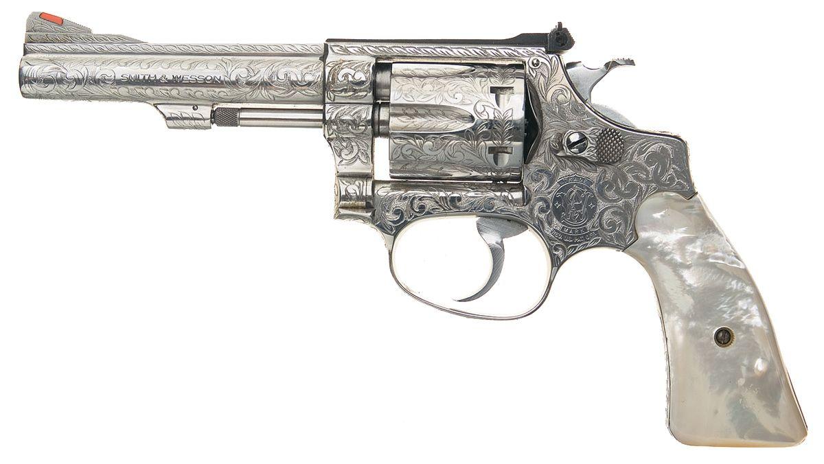 Manufactured between 1983 and 1987. Standard markings and features. The revolver is completely custom engraved with floral scrollwork on a punch dot background. The name "TOM / RAYMOND" marked on the bottom of the barrel.