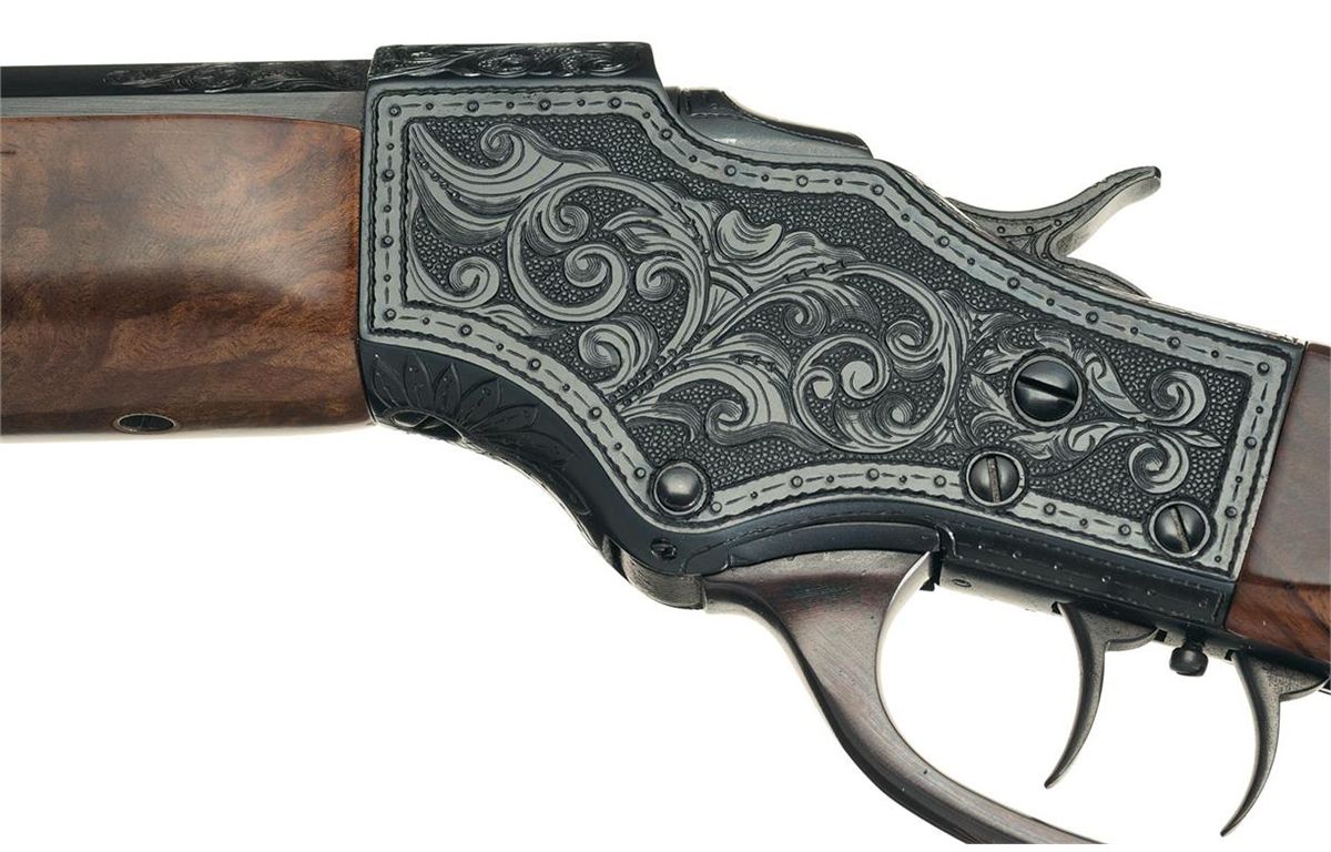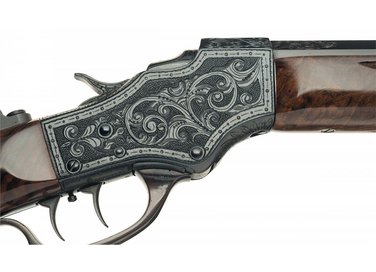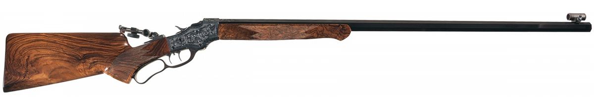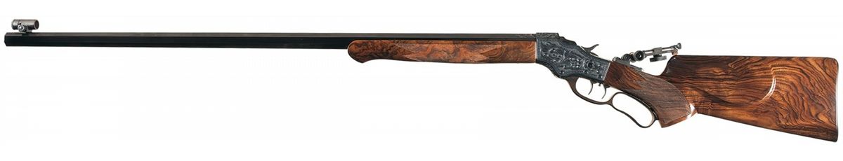 Manufactured 1896 to 1916. The receiver and upper breech end barrel flats are decorated with floral scroll engraving, with a punch dot background. The bottom front of the receiver has a floral design and the lever has a star burst and floral scroll engraving. There is a star burst on top of the breechblock and scallop and geometric bordering on the upper and lower receiver edges, and a geometric border on the sides. There are no visible markings other than "47" on the front of the receiver. Globe front sight and short range tang mounted sight. There are no provisions for a rear barrel sight. Double set triggers and mounted with an extra fancy nicely figured multi-point checkered walnut forearm and pistol grip stock with a checkered steel buttplate. Comes with a hard case.