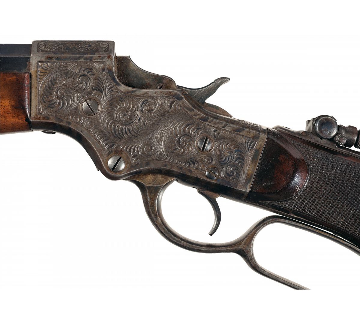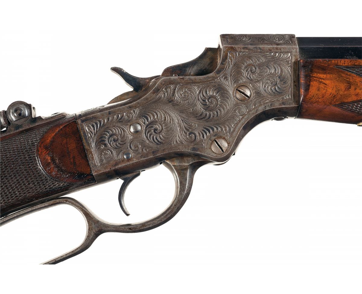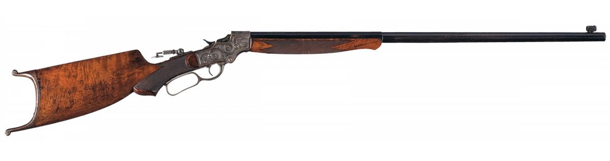 Manufactured circa 1896 to 1930s. The No. 1 barrel has a globe front sight and the top flat is tapped for sight/scope mounting. The forearm and barrel are numbered to the gun. Engraved casehardened receiver with a tang peep sight, full loop type lever and a plain trigger. The upper left barrel flat is marked "28.30" and the upper right barrel flat is marked with the two line address. Mounted with nicely figured checkered walnut Schnabel forearm and Schuetzen style buttstock with cheekpiece and Swiss style iron buttplate.