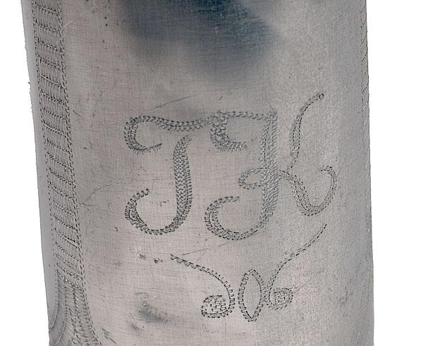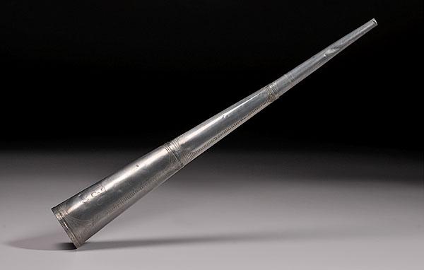 ca 1840-60s. A rare form made in three telescoping pieces, engraved with geometric designs and TK on bell end; 4" diameter at bell end x 31.7" long, extended, collapsing to 11".