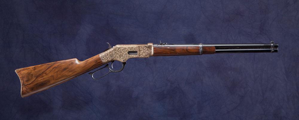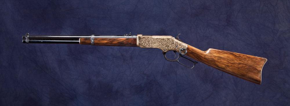 Presentation rifle by A. Uberti & C. Gardone V.T. Italy with Iver Johnsons – Fitchburg, Mass. U.S.A. markings. Model 66 in .38 SP barrel markings. Saddle ring carbine configuration with 19” barrel. Deep scroll engraved, signed on bottom of receiver Eng. C. Giovanelli (Cesare). Top tang marked To Don Mitchel from A. Uberti Serial #18071. 95% blue overall with brass frame showing patina. Wood mostly fine with one dent in forearm. * Refer to page 169 for FFA information.