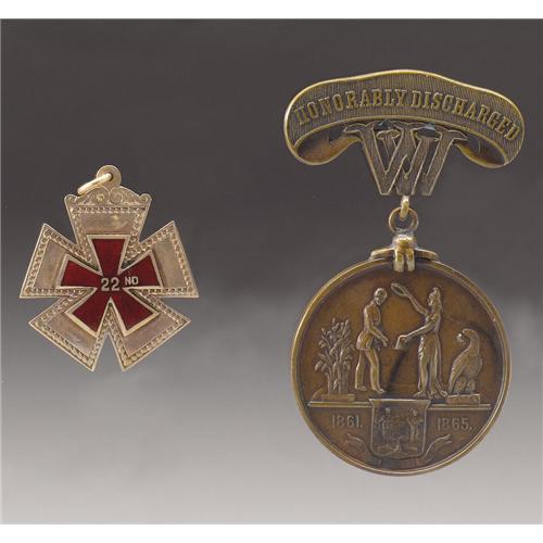 <B>Engraved Union 22nd Corps Badge With Discharge Medal.</B></I> Both of these items commemorate the Civil War service of a William J. Wood. The first piece is a 1.5” solid gold five-pointed corps badge with an applied red enamel center reading “22nd”. The reverse is professionally engraved “William J. Wood Army of the Shenandoah 59th Penna. Vol.” In excellent condition with original attachment loop. This is accompanied by a West Virginia brass service medal, 38 mm diameter, with a brass hanger, 1.75” x .5”, reading “Honorably Discharged”. The obverse shows a soldier being crowned by Liberty above a state seal between 1861 and 1865. The reverse has “Presented by the State of West Virginia” within a laurel wreath. The edge of the medal is engraved “Wm. J. Wood. Corpl. Co F. 3rd Reg Cav Vols.” Old brown toning and in extremely fine condition.<BR><BR><b>Shipping:</b> Miscellaneous Collectibles, Smal (<a target="_blank" href="http://www.heritageauctions.com/common/shipping.php">view shipping information</a>)