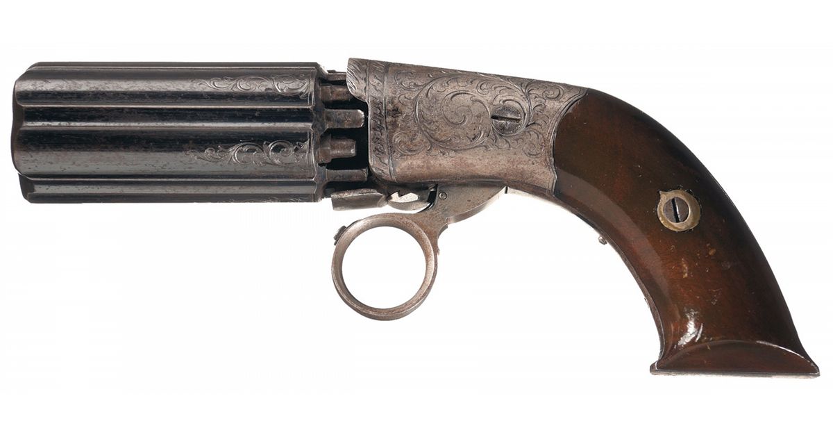 No makers markings. The pepperbox is very similar to the Blunt & Syms small frame, but with a square butt, not the bag shaped grips. The 6 barrel cluster gauges at 30 caliber, has concave ribs and light floral scroll engraving on the breech ends. The frame and back strap are also floral scroll engraved with a sun burst on top at the breech. Underhammer ring trigger, all blue finish and fitted with smooth two piece varnished walnut grips.
