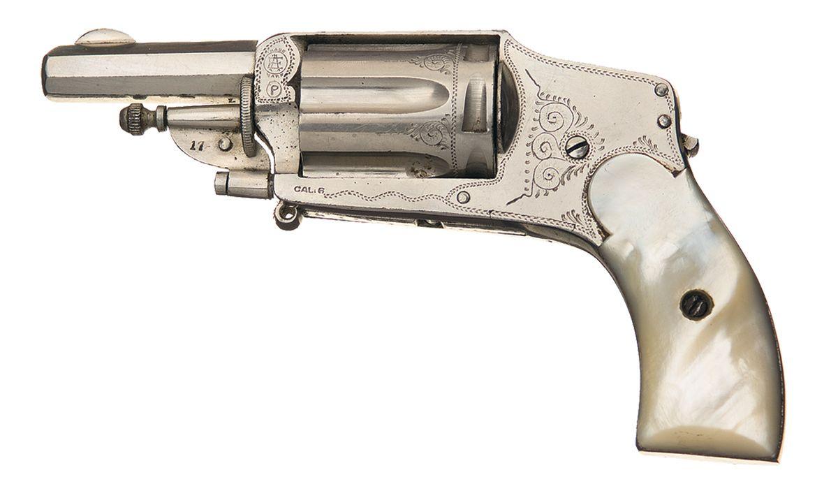 Marked "VELO-DOG" on the top strap, "AE", "TRADE / MARK", "P" and "CAL 6" on the frame. Scroll and zig-zag engraving. With smooth pearl grips.