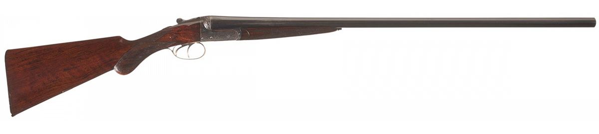 This example was manufactured in 1922. There is tight English floral scroll engraving on the sides of the receiver, on the trigger plate, on the trigger guard, on the forearm hardware and there are wedges at the breech end of the barrels. The fences have coarse deep relief oak leaf and acorn engraving. The barrels have a solid rib with a single steel bead sight, are choked light modified/full and have 2 3/4 inch chambers with ejectors. Mounted on a multi-point checkered walnut forearm and Prince of Wales pistol grip buttstock with a blank initial oval and a serrated horn buttplate. Length of pull is 14 1/2 inches.