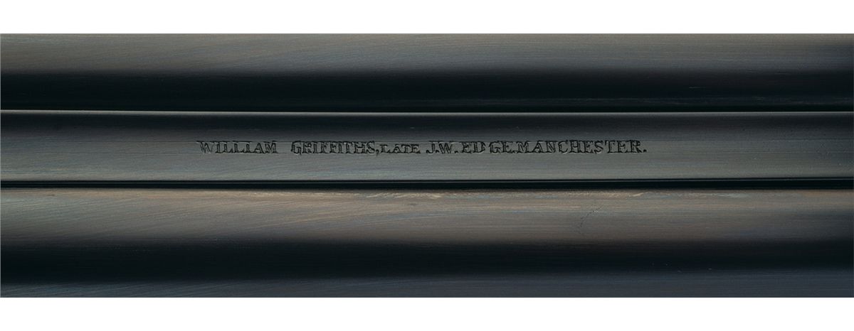 There are flourishes of floral scroll engraving on the lock plates, receiver, trigger plate, break lever, hammers and forearm hardware. There are game scenes engraved on the lock plates, bottom of the receiver and on the trigger guard. The left lock plate shows two pheasants, the right lock plate shows two quail, the bottom of the receiver shows a rabbit and the trigger guard shows a dog chasing a quail. The water table has the "Crown/V" proofmark stamped on both sides. The barrels have a single brass bead sight and the rib is engraved "WILLIAM GRIFFITHS, LATE J.W. EDGE MANCHESTER". Choked .003/.020 and has 2 3/4 inch chambers with an extractor. Mounted on a nice straight grain, multi-point checkered splinter walnut forearm with horn forend tip and straight grip stock with silver initial oval and checkered bare butt with engraved heel and toe plates. Length of pull is 14 3/4 inches.