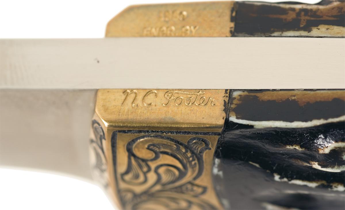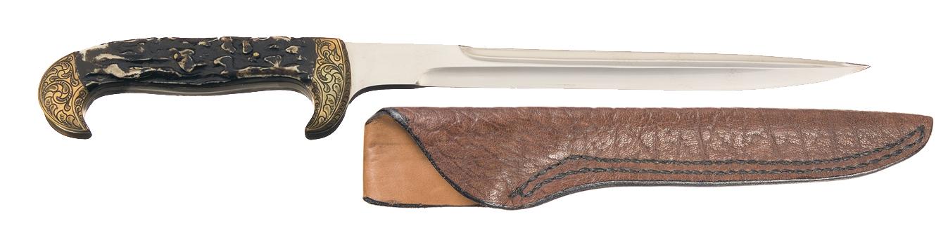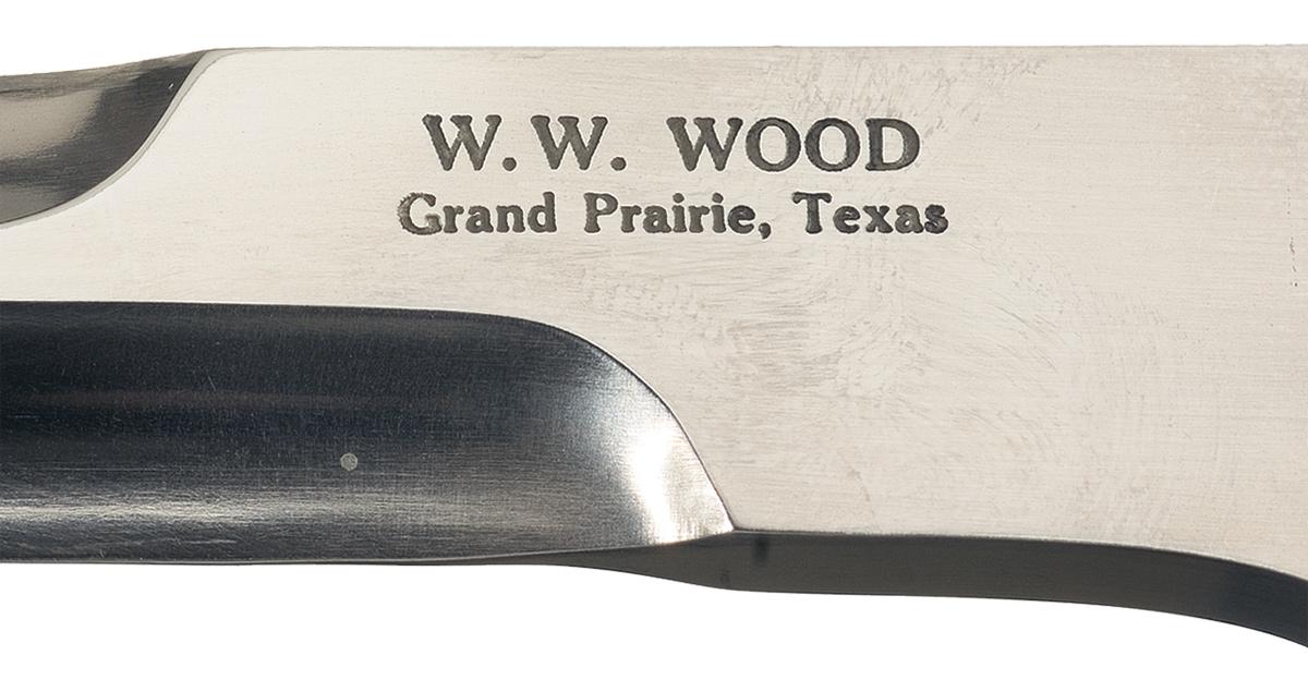 This is an example of a knife handcrafted by W.W. Wood, a professional knifemaker for over 20 years and is known worldwide for his unique knives. Wood's knives have been featured in such publications as Blade, Knives Illustrated, and Ken Warner's Knives Annual Edition. This Wood knife features an 8 3/4 inch straight blade with a seven inch false edge. The blade is marked "W.W. WOOD / Grand Prairie, Texas". The brass front and rear bolsters feature scroll engraving by N.C. Foster. The top of the right front bolster is marked "1989 / ENGR. BY", with "N.C. Foster" on top of the left front bolster. Fitted with stag scales secured to the tang with two rivets. Complete with a W.W. Wood marked sheath. OAL: 13 1/2".