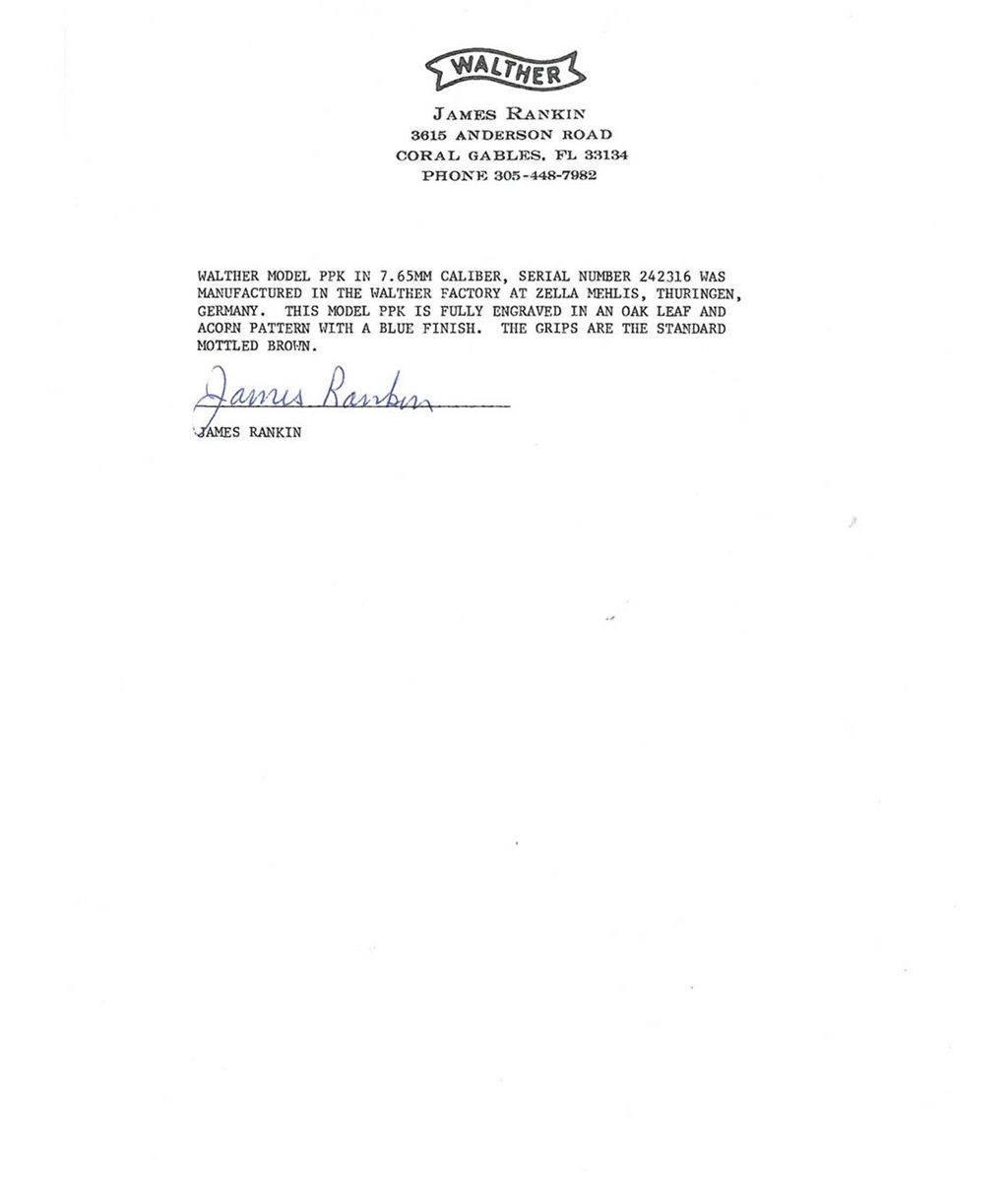 Engraved Walther PPK Semi-Automatic Pistol with Rankin Letter