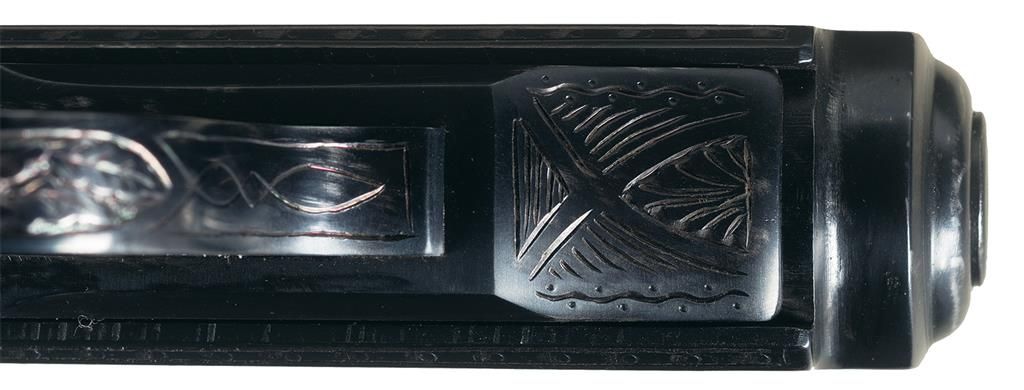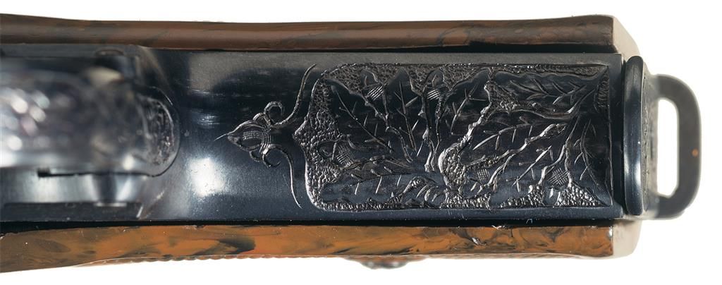 This is a beautiful example of an engraved Walther PPK, semi-automatic pistol. The pistol has been highly engraved with the traditional, deep chiseled, relief Germanic Oak Leaf and Acorn type engraving mixed with a geometric border. The engraving covers over 98% of the pistol. This pattern is very similar to several of the special order engraved Walthers shown in "Walther Volume II, Engraved, Presentation and Standard Walther Pistols" by Rankin. The serial number is stamped on the right side of the frame with the last three digits, "316" correctly scratched on the inside of the slide. The slide is marked with the full Walther factory two line address and caliber markings followed by "Mod. PPK" in a small circle. The right side of the slide, frame and barrel all show the correct early "CrownN" proof marks, as used until approximately April 1940. The slide is fitted with the standard sights and 60 degree safety. It has the standard mottled brown Walther one-piece plastic grips, with "WALTHER" inside a at the top of each grip. It is complete with a "Walther/PPK 7,65mm" marked magazine which has also been engraved on the underside of the base plate. With a signed letter from James Rankin, author, stating that the pistol is Zella-Mehlis production, and features full oak leaf and acorn pattern engraving. It does not state whether the factory performed the engraving work.