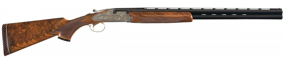 Introduced in 1989. There is floral scroll engraving on the receiver, side plates, trigger guard and break lever. The barrel has a single brass bead sight, is threaded for choke tubes with cylinder/cylinder installed and 3 inch chambers with ejectors. Mounted on a beautifully figured multi-point checkered walnut forearm and pistol grip stock with a contrasting grip cap and a factory recoil pad. Length of pull is 14 inches.
