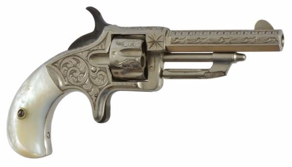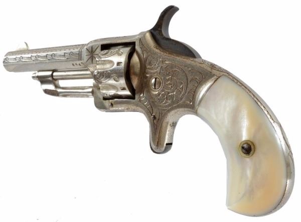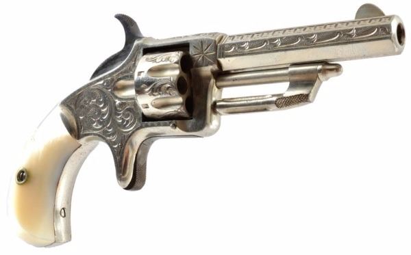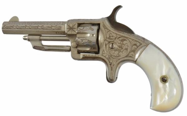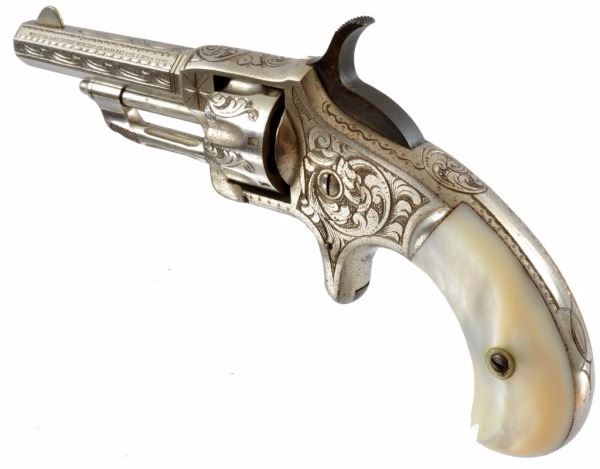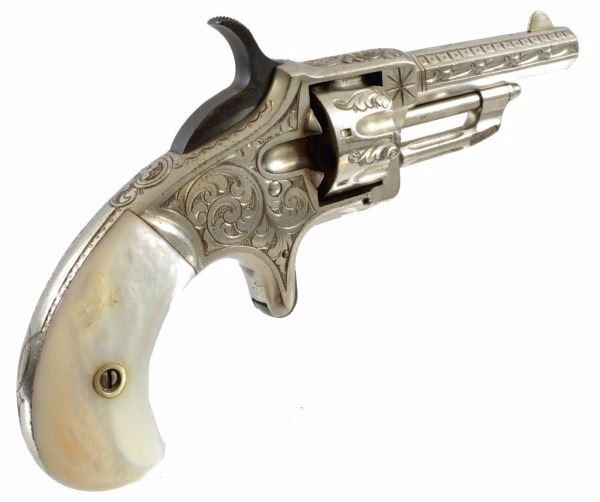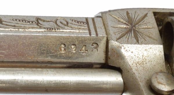 Serial no. 6943 .22 engraved Wesson And Harrington Model 2 Breech Loading .22 Caliber Rimfire in very good condition with pearl grips. cocks but cylinder does not rotate. an 1870’s revolver made by Frank Wesson and his nephew Gilbert Harrington. Frank Wesson was the brother of Dan Wesson who founded Smith & Wesson. in the 1870s Wesson & Harrington ended the partnership. Gilbert Harrington joined William Richardson to form the Harrington & Richardson Arms Co.