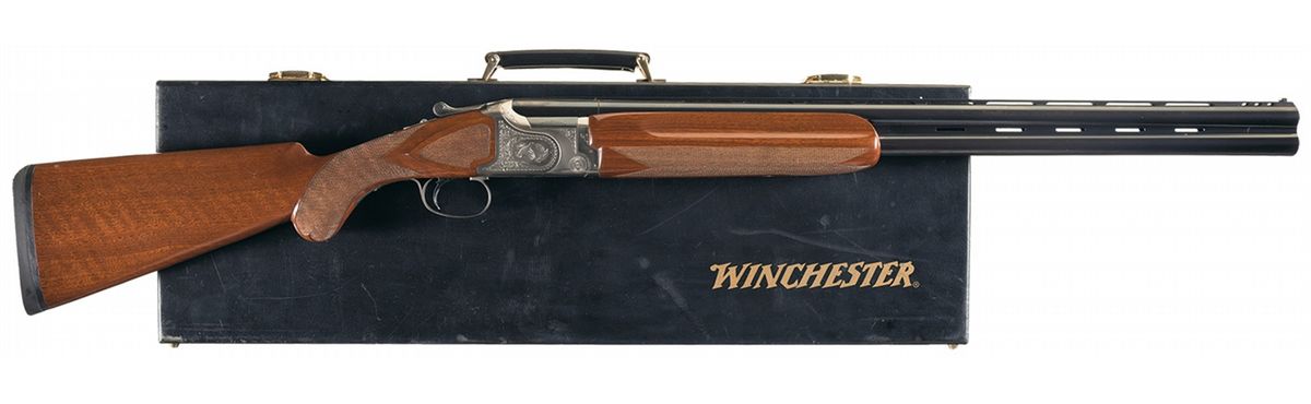 The barrels have two white bead sights, are threaded for Winchokes with modified/improved modified installed and have 3 inch chambers with ejectors. The receiver has floral scroll patterns with a pheasant on the left side and two grouse on the right side. Mounted on a multi-point checkered walnut forearm and round knob pistol grip stock with Kick-Eez recoil pad. Length of pull is 14 1/4 inches. With a black Winchester takedown hardcase, original hang tag, four extra choke tubes and a choke wrench.