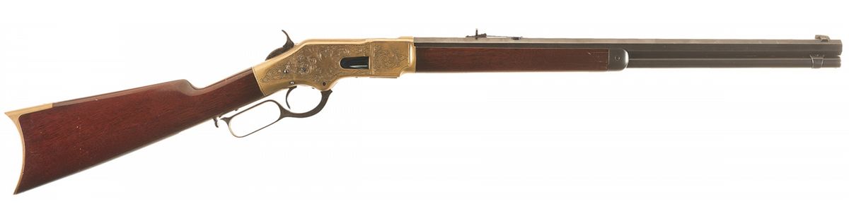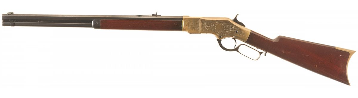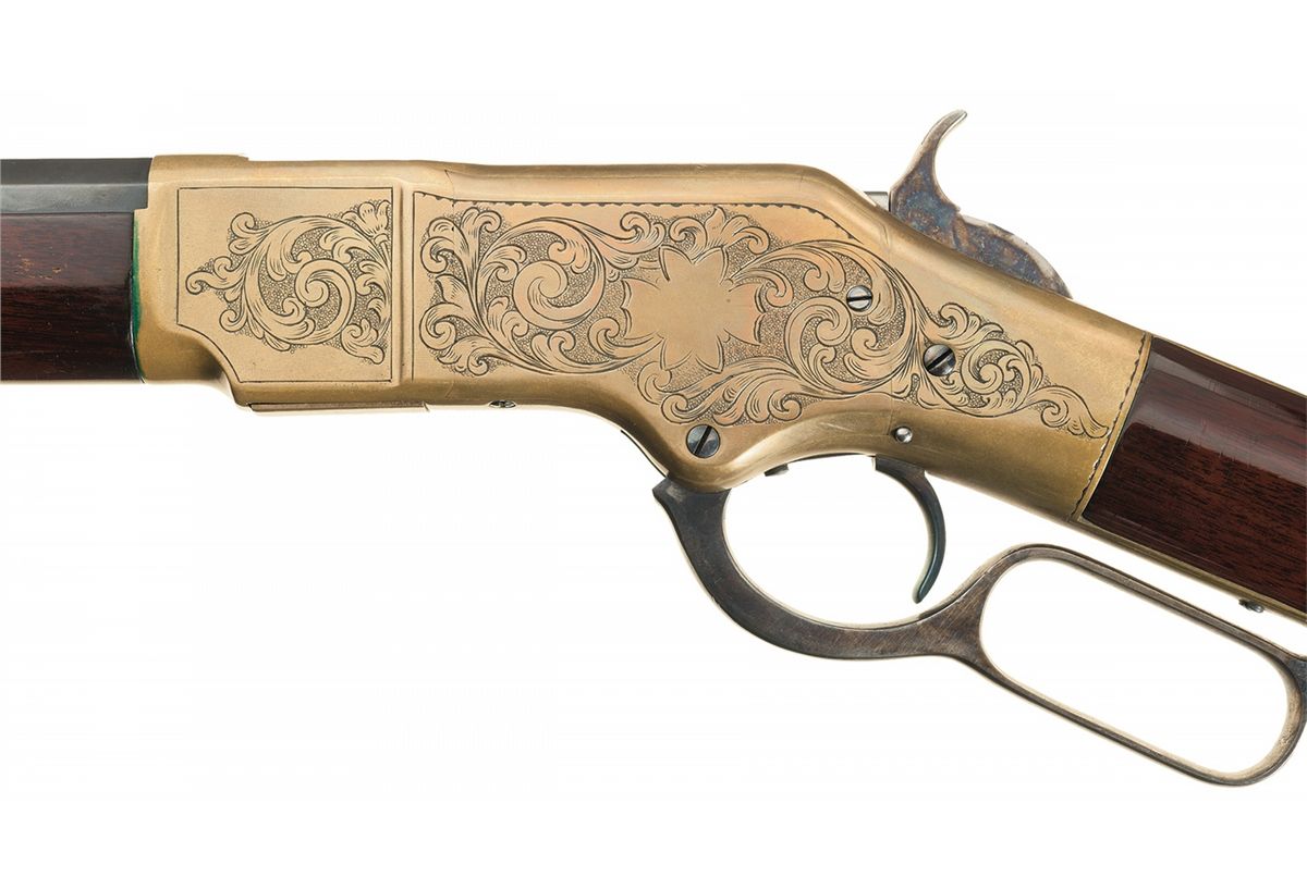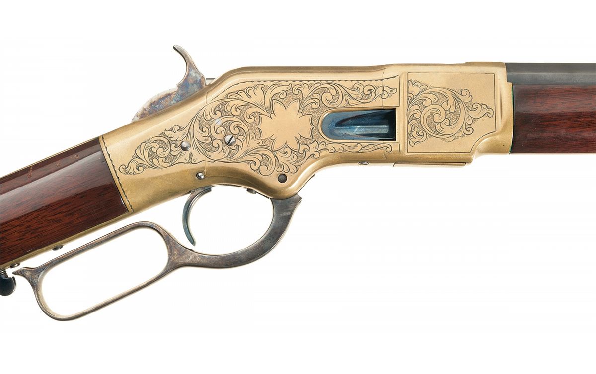 Manufactured in 1881. Floral scroll and punch dot engraving on the receiver. Two line address/King's improvement patent dates on the top barrel flat ahead of the rear sight and the serial number on the lower tang. Blade front and adjustable sporting rear sights, and mounted on a replacement smooth high gloss varnished walnut forearm and straight grip stock with a brass crescent buttplate. There is no letter with the rifle, but the engraving appears to be factory quality.