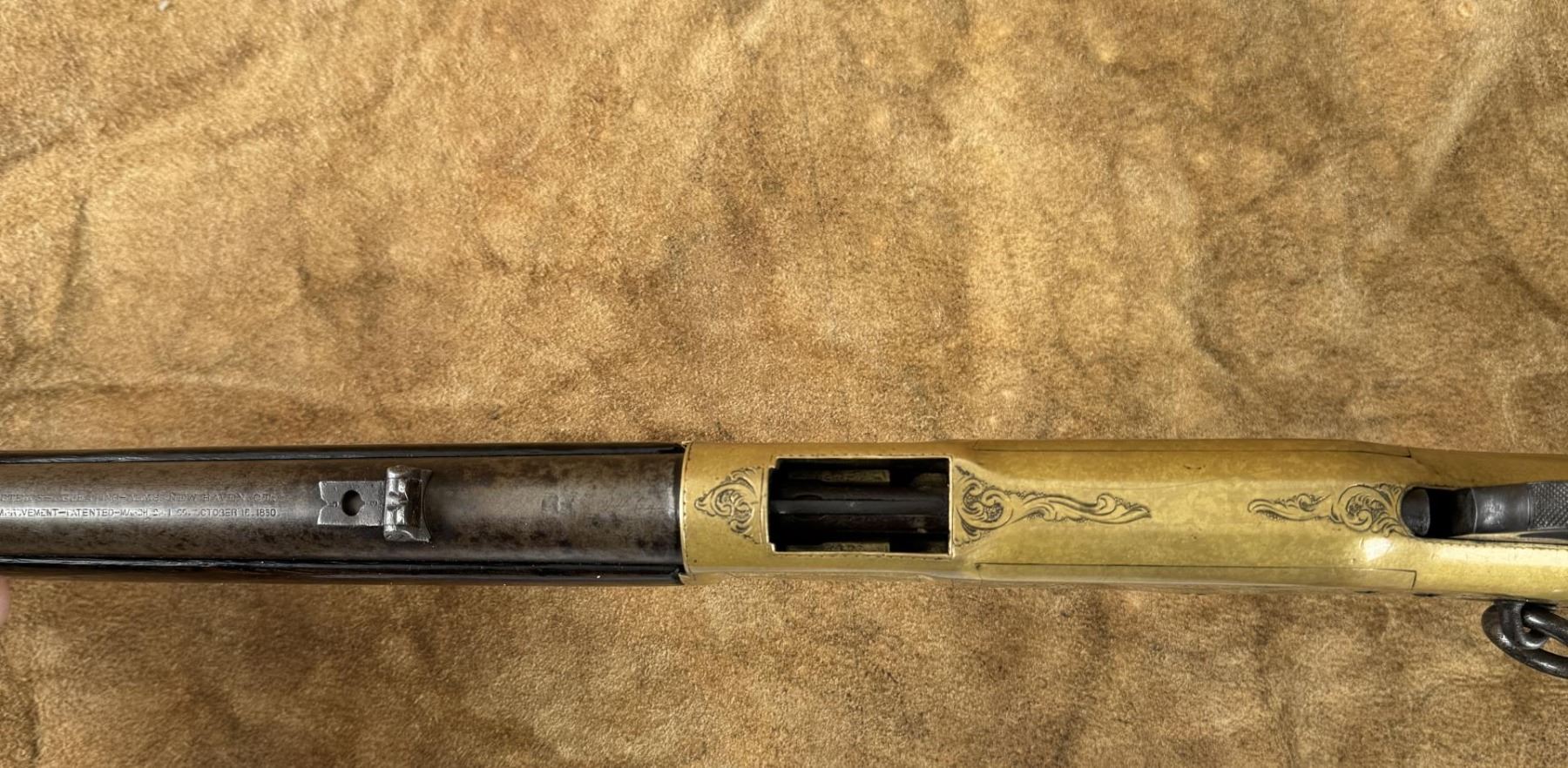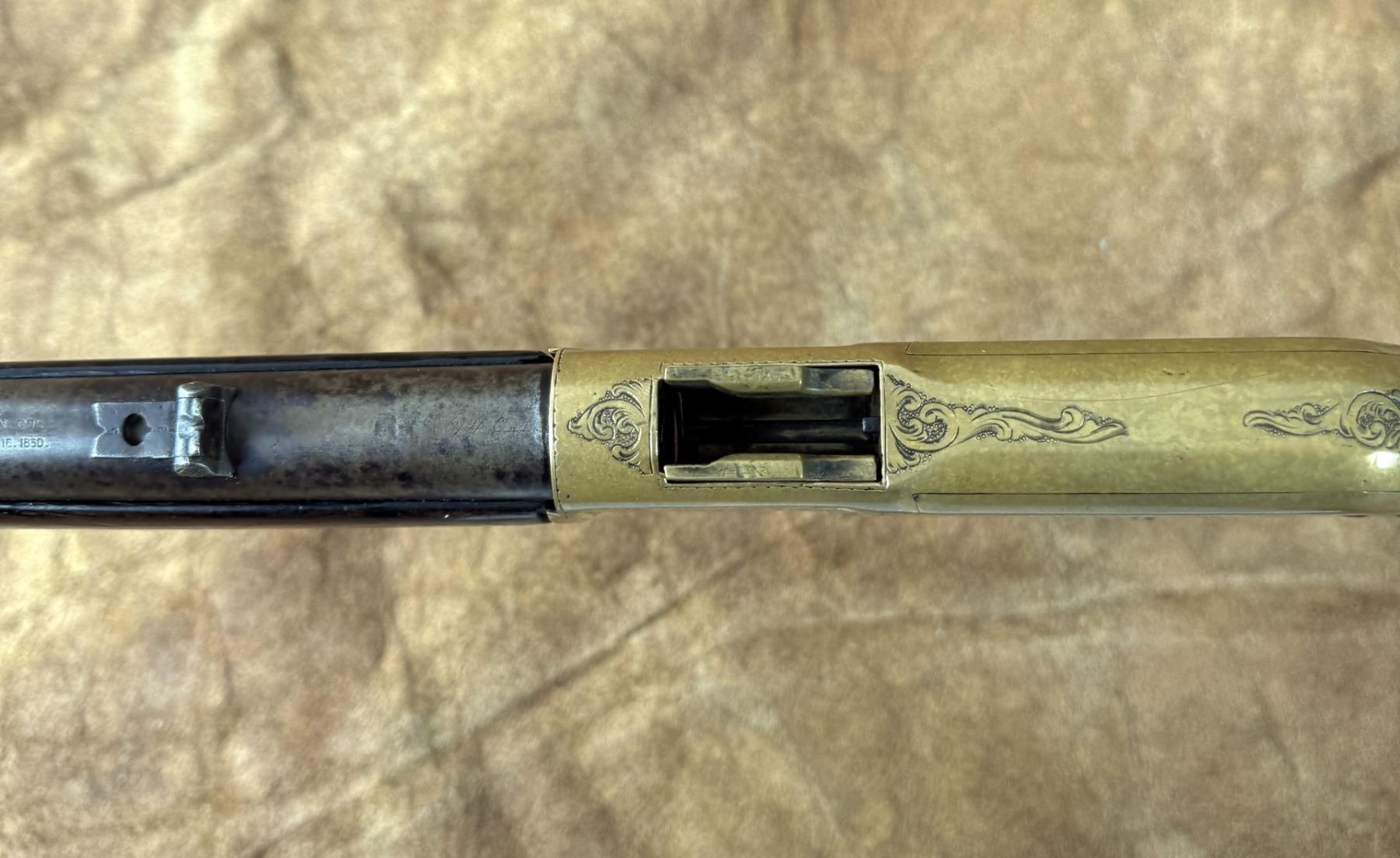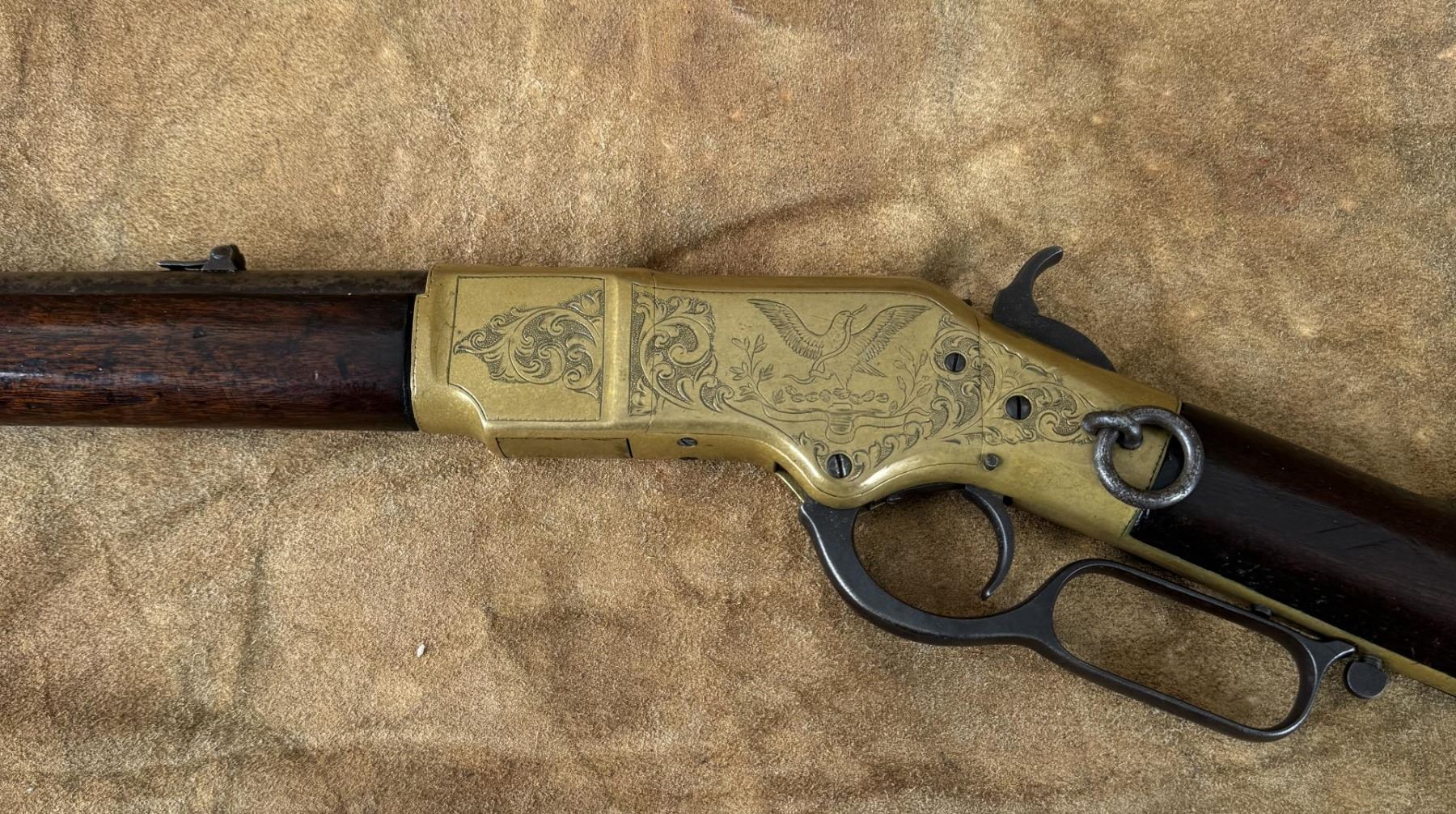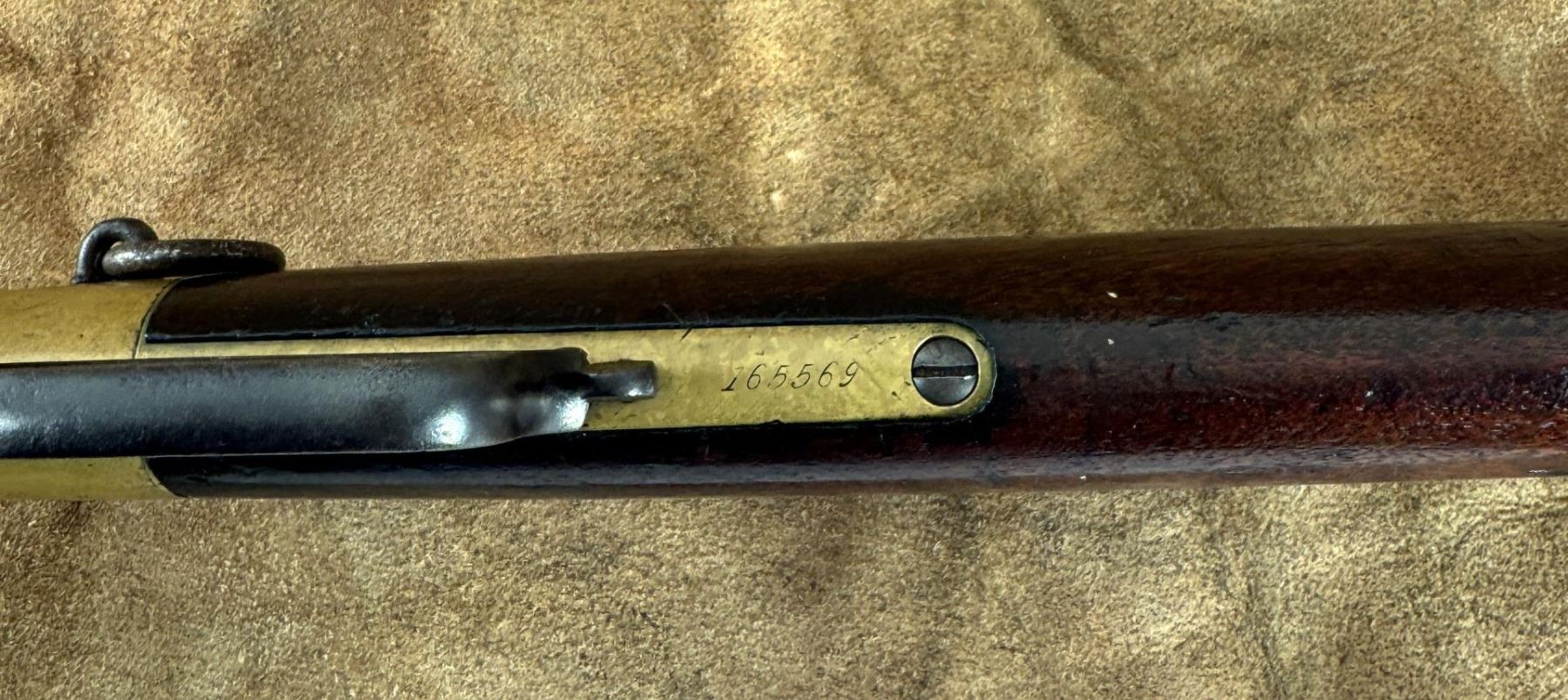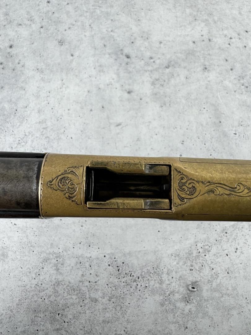 Factory Engraved Winchester Model 1866 Saddle Ring Carbine Attributed to the Ulrich Brothers .44RF. 20" round barrel. SN: 165569 (mfg. ca.1887). Blued finish, color casehardened lever and hammer, brass receiver and furniture, walnut stock and forend with single barrel band. Lever action tubular magazine fed lever action saddle ring carbine. Antique, does not require FFL Transfer. No International shipping. Barrel marked in two lines: WINCHESTER'S - REPEATING - ARMS. NEW HAVEN, CT/KING'S - IMPROVEMENT - PATENTED - MARCH 29, 1866, OCTOBER 16, 1860. Top of barrel, forward of receiver engraved .44 CAL. Serial number stamped in italics on lower tang. Left side of lower tang, under stock is numbered 122 and the toe of the buttplate is number numbered 3594 on the interior. The receiver is engraved with flowing Arabesque scrolls with punch dot background shading with the central panel on the obverse being a flower with a blank interior that could have been used as a presentation panel. The reverse receiver features a somewhat folksy Mexican Eagle & Snake motif. Similar extant examples exist and are published in the Book of Winchester Engraving by Wilson and in Madis' The Winchester Book. In both cases the engraving is attributed to the Ulrich Brothers. The upper tang and part of the top of the receiver are engraved ensuite with the same style of Arabesque scrolls. The carbine retains the saddle ring and staple on the left side of the receiver, the L-shaped aperture leaf rear sight, the musket style post and blade front sight, forend barrel band, barrel and magazine tube band near muzzle and the three-piece cleaning rod in the butt trap.