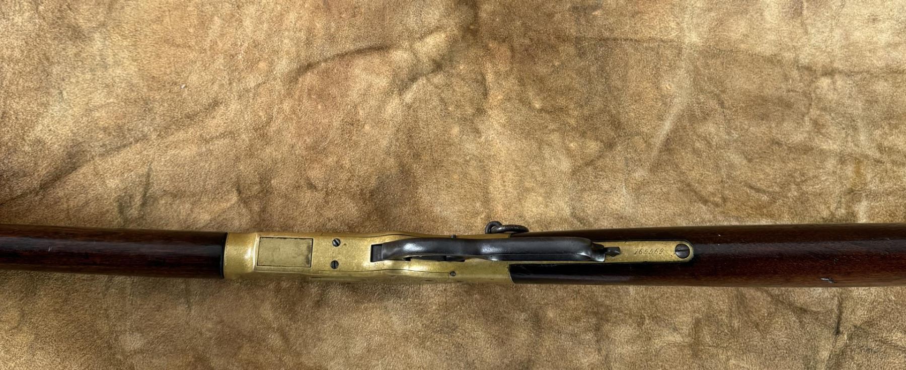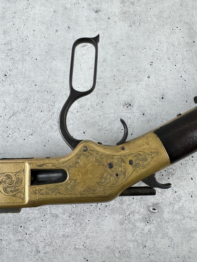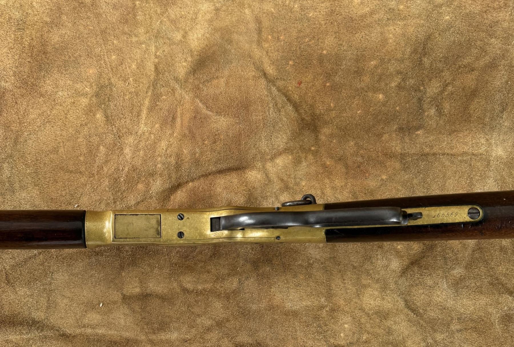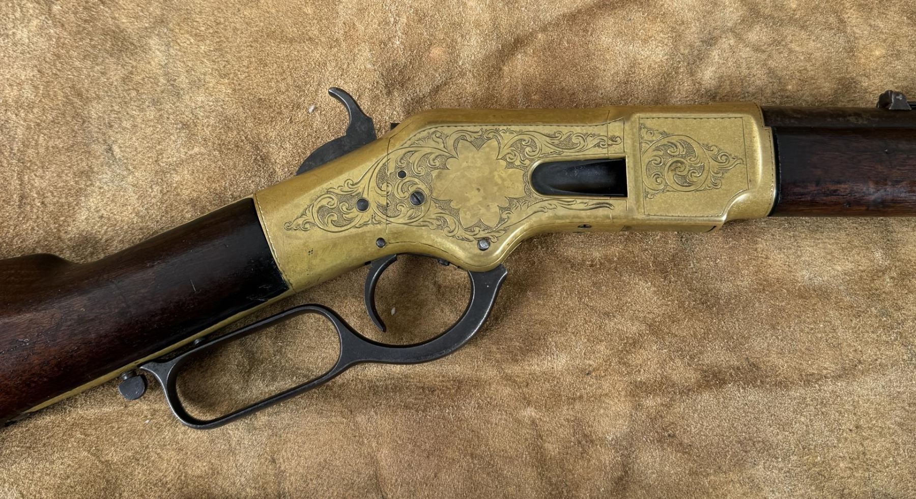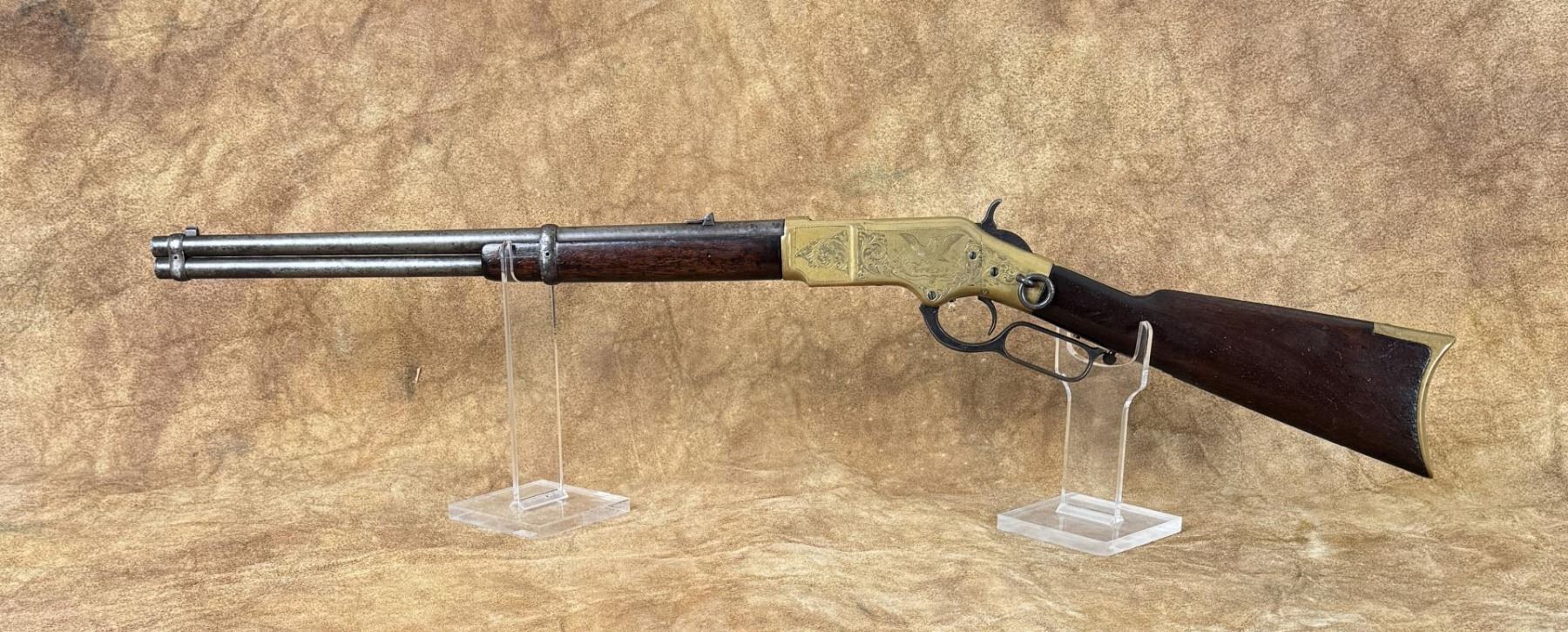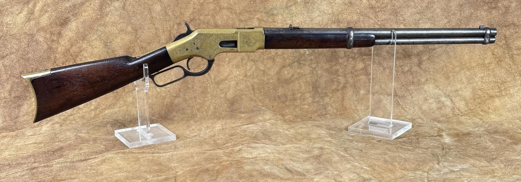 Factory Engraved Winchester Model 1866 Saddle Ring Carbine Attributed to the Ulrich Brothers .44RF. 20" round barrel. SN: 165569 (mfg. ca.1887). Blued finish, color casehardened lever and hammer, brass receiver and furniture, walnut stock and forend with single barrel band. Lever action tubular magazine fed lever action saddle ring carbine. Antique, does not require FFL Transfer. No International shipping. Barrel marked in two lines: WINCHESTER'S - REPEATING - ARMS. NEW HAVEN, CT/KING'S - IMPROVEMENT - PATENTED - MARCH 29, 1866, OCTOBER 16, 1860. Top of barrel, forward of receiver engraved .44 CAL. Serial number stamped in italics on lower tang. Left side of lower tang, under stock is numbered 122 and the toe of the buttplate is number numbered 3594 on the interior. The receiver is engraved with flowing Arabesque scrolls with punch dot background shading with the central panel on the obverse being a flower with a blank interior that could have been used as a presentation panel. The reverse receiver features a somewhat folksy Mexican Eagle & Snake motif. Similar extant examples exist and are published in the Book of Winchester Engraving by Wilson and in Madis' The Winchester Book. In both cases the engraving is attributed to the Ulrich Brothers. The upper tang and part of the top of the receiver are engraved ensuite with the same style of Arabesque scrolls. The carbine retains the saddle ring and staple on the left side of the receiver, the L-shaped aperture leaf rear sight, the musket style post and blade front sight, forend barrel band, barrel and magazine tube band near muzzle and the three-piece cleaning rod in the butt trap.
