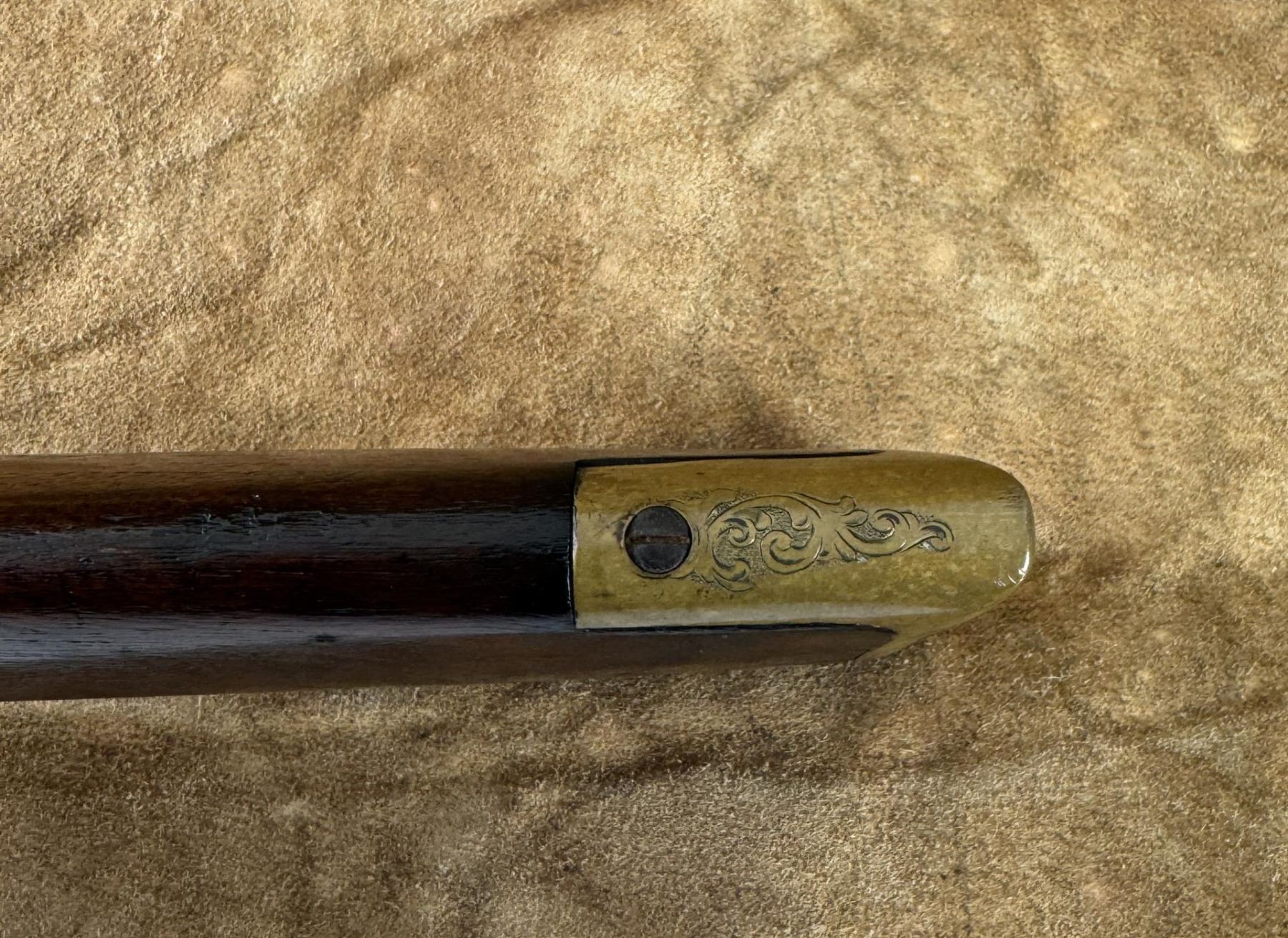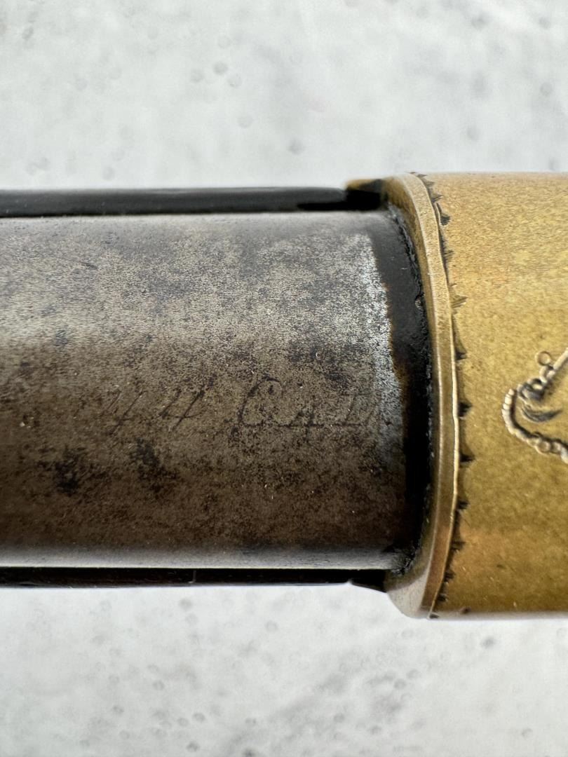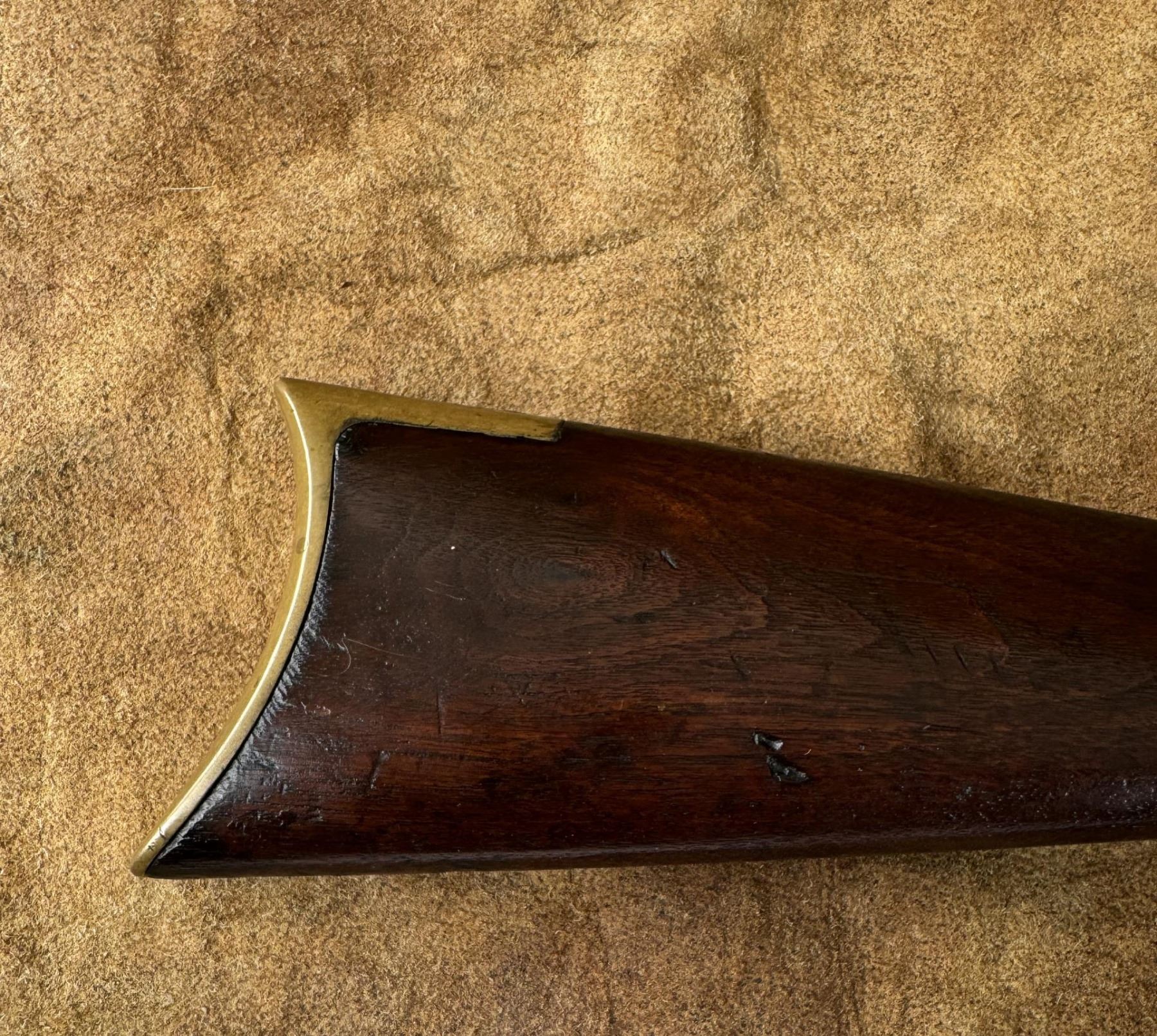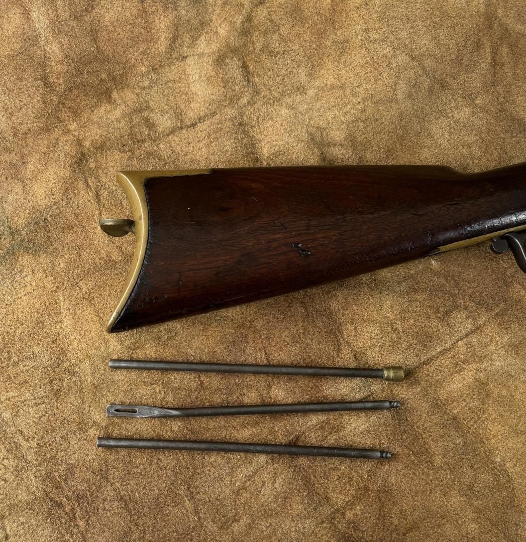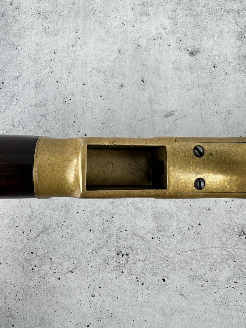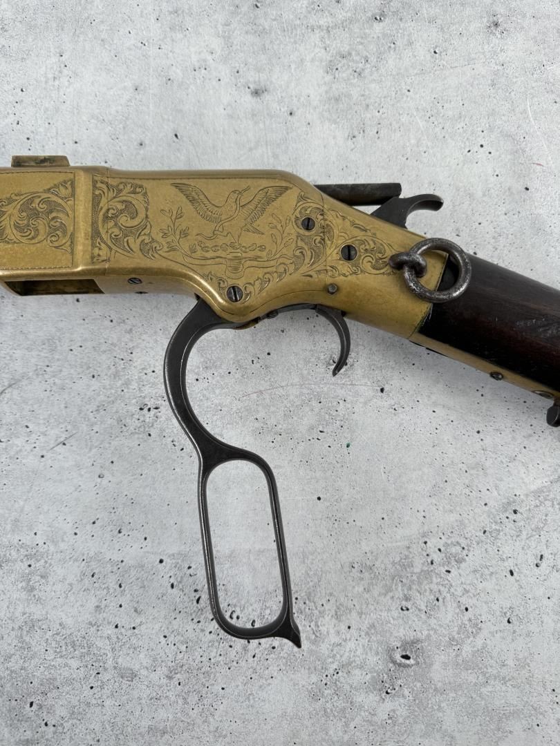Factory Engraved Winchester Model 1866 Saddle Ring Carbine Attributed to the Ulrich Brothers .44RF. 20" round barrel. SN: 165569 (mfg. ca.1887). Blued finish, color casehardened lever and hammer, brass receiver and furniture, walnut stock and forend with single barrel band. Lever action tubular magazine fed lever action saddle ring carbine. Antique, does not require FFL Transfer. No International shipping. Barrel marked in two lines: WINCHESTER'S - REPEATING - ARMS. NEW HAVEN, CT/KING'S - IMPROVEMENT - PATENTED - MARCH 29, 1866, OCTOBER 16, 1860. Top of barrel, forward of receiver engraved .44 CAL. Serial number stamped in italics on lower tang. Left side of lower tang, under stock is numbered 122 and the toe of the buttplate is number numbered 3594 on the interior. The receiver is engraved with flowing Arabesque scrolls with punch dot background shading with the central panel on the obverse being a flower with a blank interior that could have been used as a presentation panel. The reverse receiver features a somewhat folksy Mexican Eagle & Snake motif. Similar extant examples exist and are published in the Book of Winchester Engraving by Wilson and in Madis' The Winchester Book. In both cases the engraving is attributed to the Ulrich Brothers. The upper tang and part of the top of the receiver are engraved ensuite with the same style of Arabesque scrolls. The carbine retains the saddle ring and staple on the left side of the receiver, the L-shaped aperture leaf rear sight, the musket style post and blade front sight, forend barrel band, barrel and magazine tube band near muzzle and the three-piece cleaning rod in the butt trap.