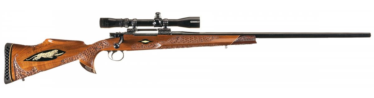 This is a high-grade semi-custom sporting rifle built by Winslow Arms Co. of Camden, South Carolina. The barrel is manufactured without sights and the caliber marking is on the left side at the breech. The receiver features a scroll engraving with Winslow markings on the left side. The scrollwork extends to the scope mount, scope rings and trigger guard. Equipped with a Redfield Lo-Pro scope. Jeweled follower, extractor and follower. The stock is a nicely figured Plainsmaster style, which has a full curled hooked pistol grip and a wide, flat beavertail forearm. An extensive deep relief basket weave and oak leaf pattern is featured on the forearm and grip area with the oak leaf pattern extended to the rear of the buttstock and on the forend tip and grip cap. The forend tip and grip cap are contrasting rosewood and the grip cap has an monogrammed ivory diamond. An ivory shield inlay with a knight's helmet and checkerboard pattern is also on the underside of the forearm. The sides of the forearm have an ivory/ebony inlaid diamond pattern and the right side of the buttstock has a detailed ivory inlaid tiger on an ebony background. The stock also has a cheekpiece, sling swivel studs and vented Pachmayr recoil pad.