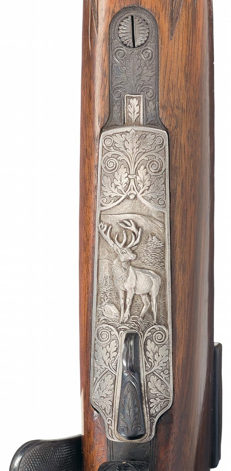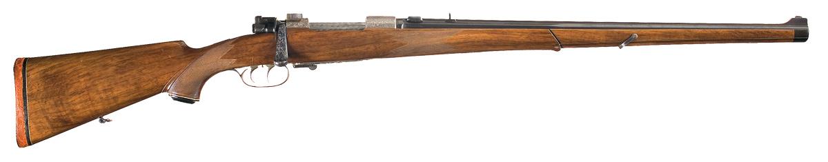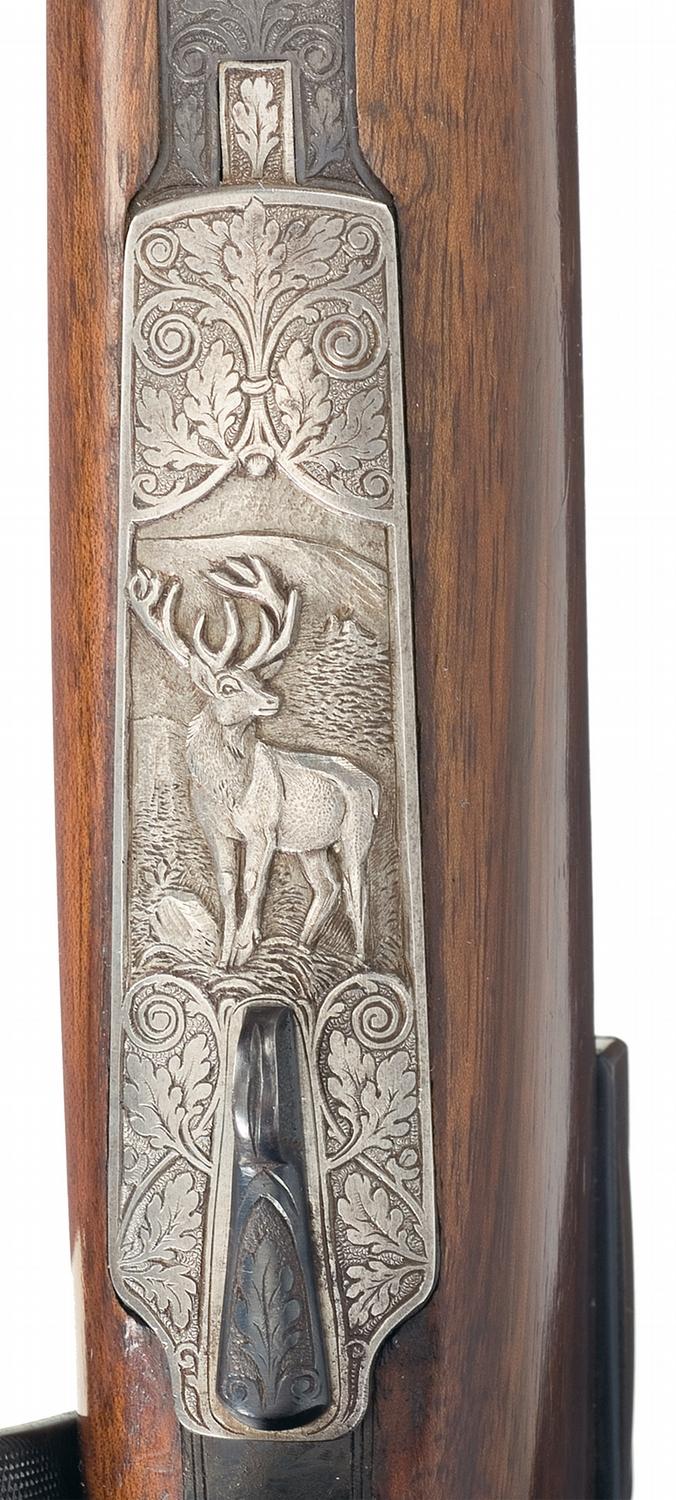 Established in 1857, the arms works of Johann Peterlongo operated out of Innsbruck in the Austrian state of Tyrol. Ramp blade front and fixed notch rear sights, with zig-zag patterned texture on the rib, "560 7.64" on the left flat, and light border engraving at the rear of the barrel. "NPf" smokeless powder proofs, with a pair of claw mount bases. Near full coverage checkerboard and oak leaf engraving on the receiver and trigger guard, with an stag on the trigger guard and relief engraved stag scene on the floor plate. Equipped with double triggers, turned bolt safety, sliding tang safety and a butter knife bolt. Checkered fancy Mannlicher style two-piece stock, with a horn tip and insert, raised carved oak leaf designs behind the raised cheekpiece, sling swivels and a solid recoil pad.