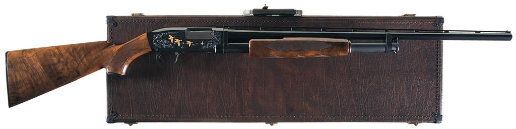 Manufactured in 1989. The barrel has a single steel bead sight, is choked modified and has a 2 3/4 inch chamber. The sides of the receiver have floral scroll designs with the left side having two gold highlighted dogs pointing at a gold highlighted grouse in flight. The right side shows four gold inlaid ducks flying over a marshy area. Mounted on a nicely figured multi-point checkered extended walnut forearm and pistol grip stock with steel grip cap and plastic buttplate. Length of pull is 14 inches. With a brown leatherette takedown hardcase.
