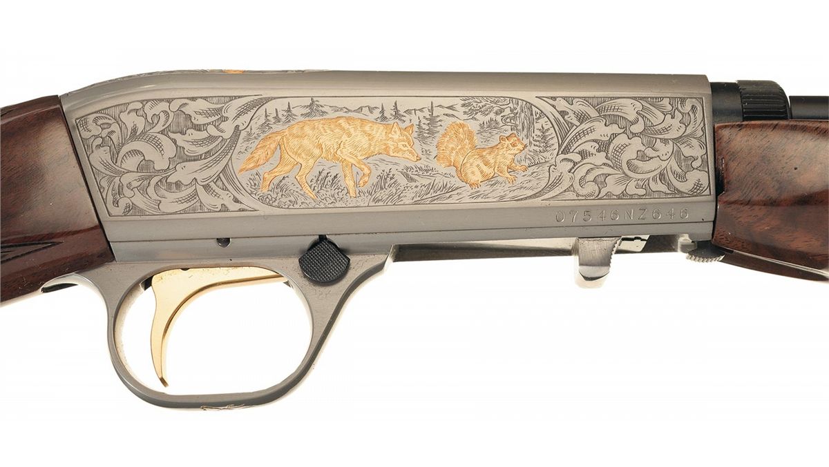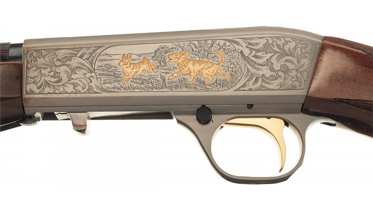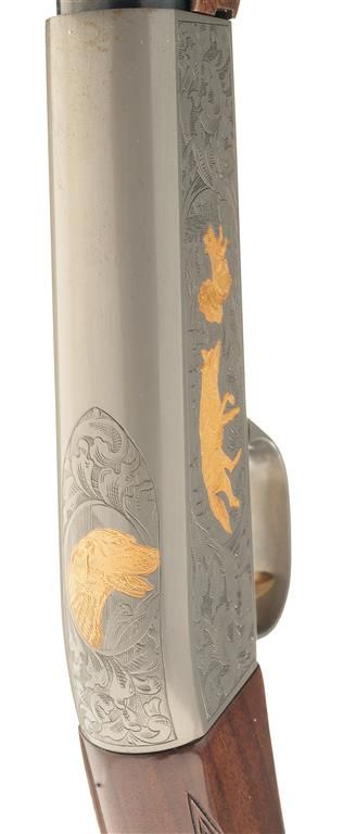 Manufactured in 1991 with floral scroll engraved receiver with game scenes on each side. The left shows a gold highlighted dog chasing a rabbit in a field and the right shows a gold highlighted fox following a squirrel in a wooded area. The top of the receiver has a gold highlighted dogs head with floral scroll around it. Mounted on a nicely figured multi-point checkered walnut forearm and pistol grip stock with a serrated steel buttplate. With the original box numbered to the gun.