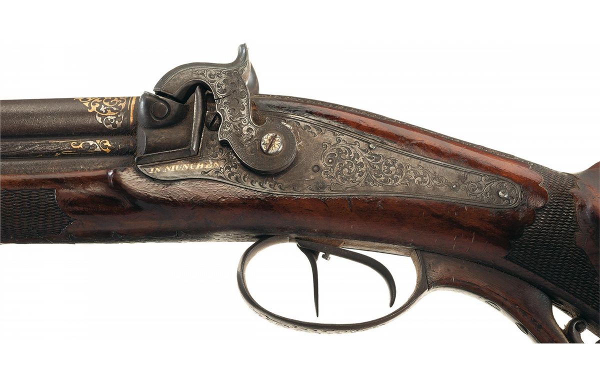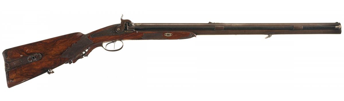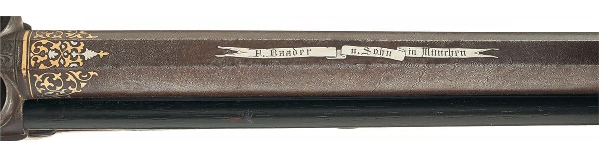This percussion rifle once belonged to the Royal Bavarian Gun Cabinet which is documented by the crest crown with two swords between the two hammers and was manufactured by F. Baader, a premier gunmaker in Munich, Germany. Equipped with a blade front sight and a two leaf rear sight. The over/under barrels are Damascus with the top barrel rifled and the lower barrel appearing to have been originally smooth. The top barrel has a silver inlaid fancy banner marked "F. Baader u. Sohn in Munchen" and at the rear of the barrel is a silver and gold scroll pattern inlay. A German silver tipped ebony ramrod is positioned between the barrels on the right side. A scroll engraving is featured on the lock plates, barrel tang, left hammer, trigger guard, trigger guard finial and flat buttplate. The right lock plate has "F. BAADER" inlaid in gold ahead of the hammer and the left lock plate has "IN MUNCHEN" inlaid in gold ahead of the hammer. The action screws have inlaid gold flower blossoms. Double set triggers, dog face carved walnut trigger guard extension and checkered and floral carved walnut patch box. The half stock features fancy checkering on the forearm and wrist, a cheekpiece, a floral carving on the forearm tip and a deep relief carving of a stag in a woodland scene at the rear of the buttstock on the left side.