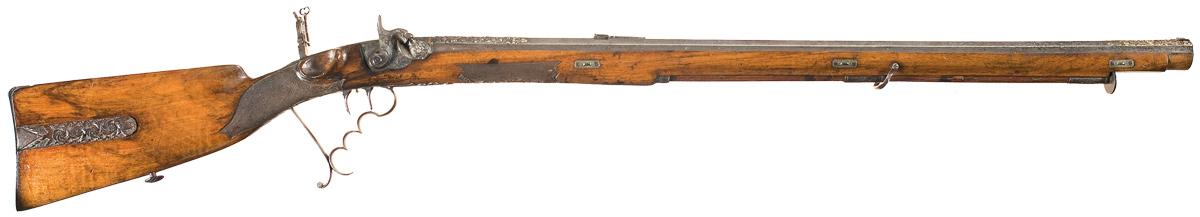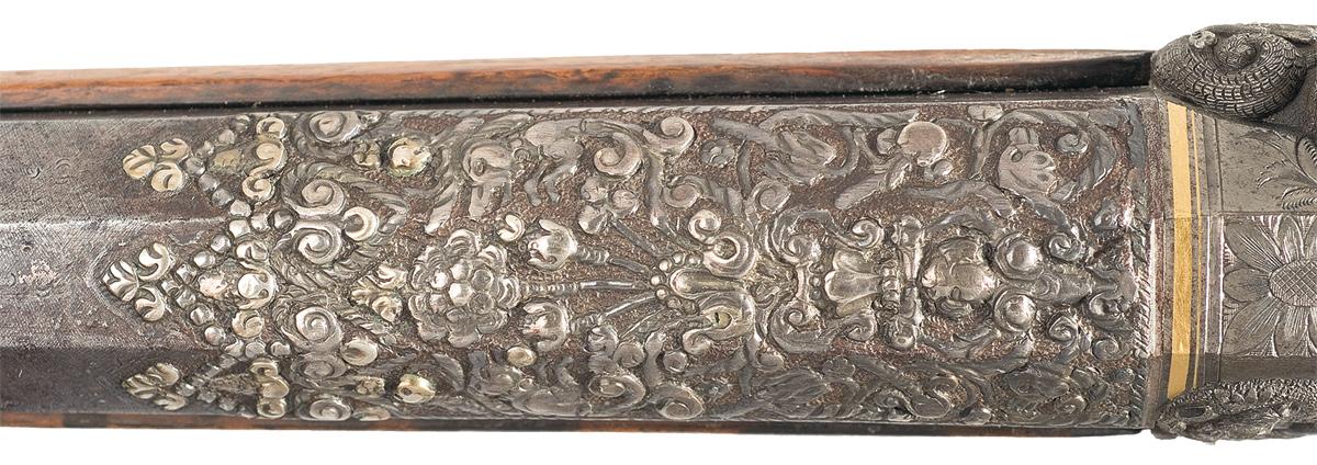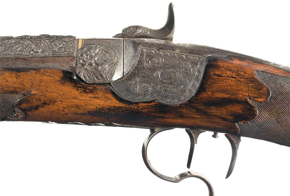 Condition: Fine. The barrel shows a mixed gray patina with mild spotting and handling marks, the silver components showing a fine aged patina and the gold strong. The frame has turned a smooth gray patina. Stock is very good, with two areas of lost material on and below the cheekpiece and light pressure dents and scratches overall. Mechanically fine.