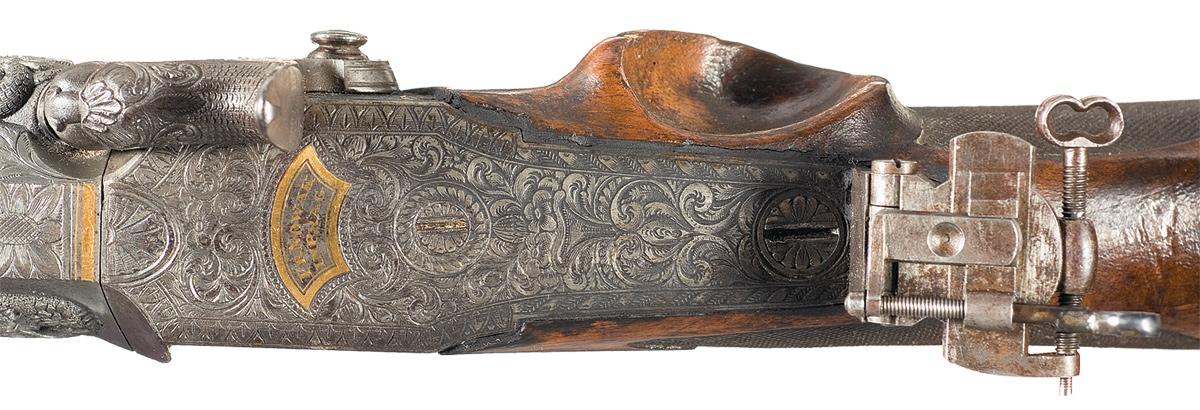 Produced in Prague. Blade front, notch rear and tang mounted fully adjustable folding peep sight, with a 3 3/5 inch long floral and scroll decorated silver panel at the muzzle, light engraving down the top and upper flats with repeated patterns of winged figures and checkered backgrounds, a 3 4/5 inch silver panel, similar to the first, ahead of the breech, which has a flower engraved on the top, gold border bands and a raised relief chiseled scene featuring a lady and a dog on the left side. Near-full coverage scroll and floral engraving on the frame, with scroll designs on the dog head hammer, a raised beast on the bolster, and "FR.NOWAK/ IN PRAG" inlaid in gold on top of the receiver. Double set triggers, with a finger rest guard. Full length stock, with a rounded tip followed by a flat on the underside, checkered forearm and wrist with raised carved scrolls and "crown/K" in a silver plate on the forearm and a right side thumb rest on the wrist, burl walnut grain on the butt with a raised cheekpiece, floral carved patch box lid and an engraved buttplate.