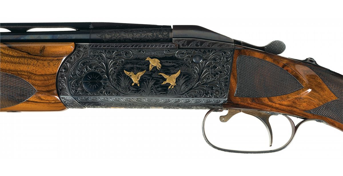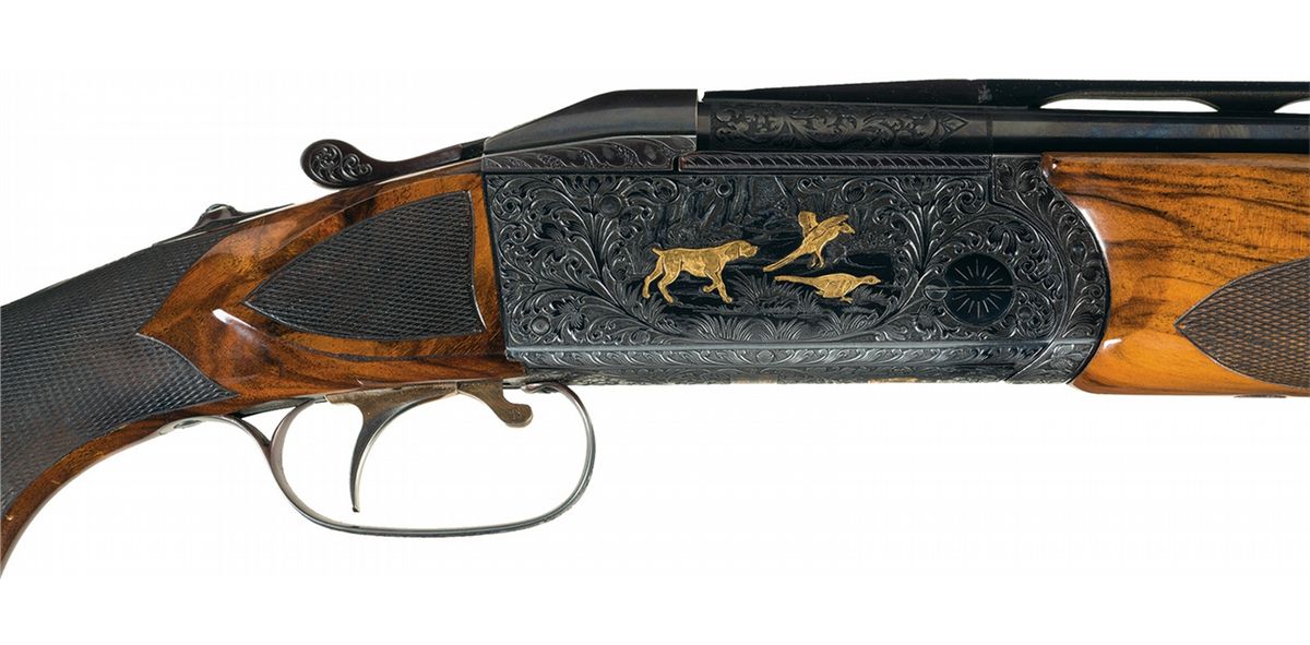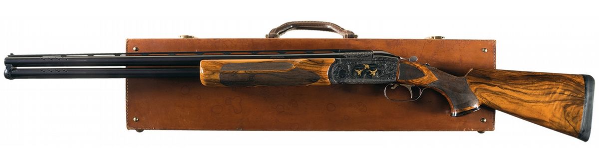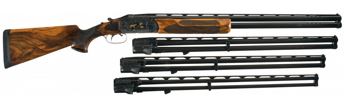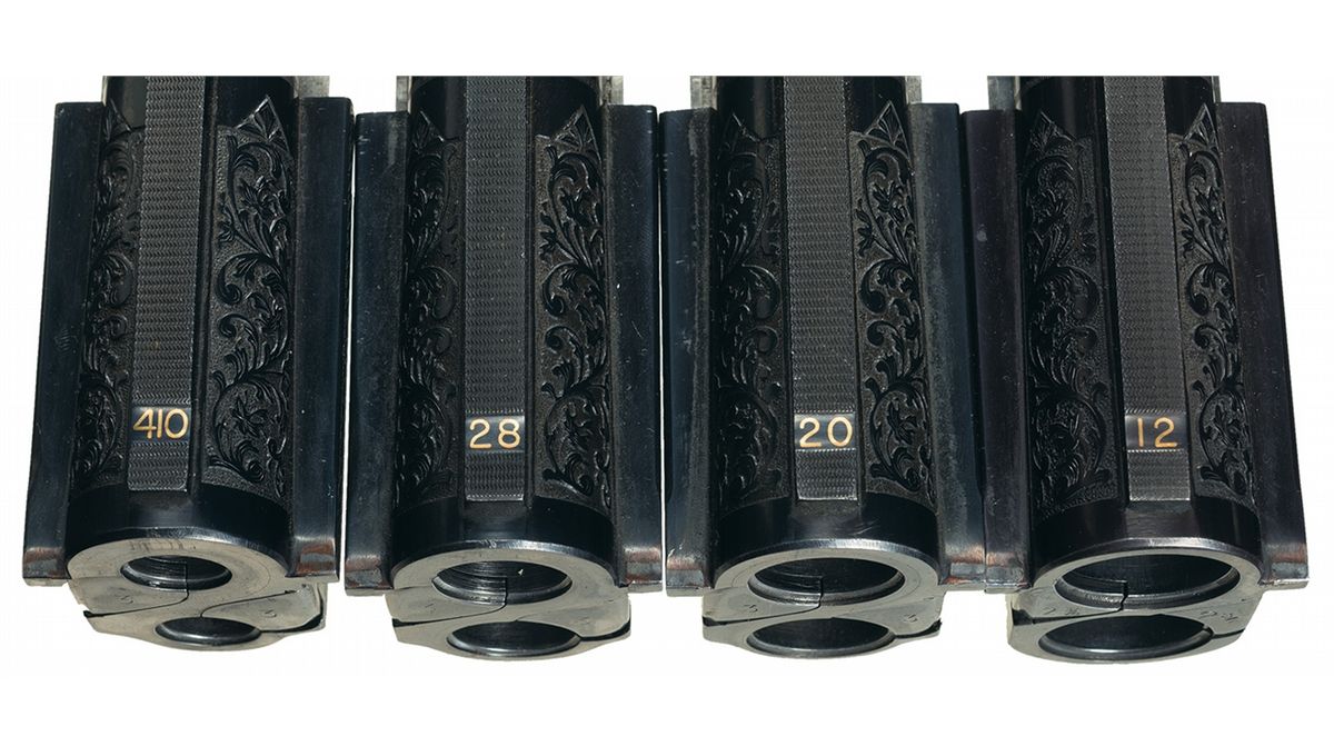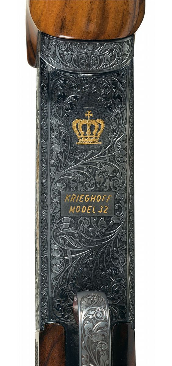 This example has an extensive amount of beautifully executed floral scroll engraving with a game scene on each side. The left shows three gold inlaid ducks landing in a marshy area. The right side shows a gold inlaid dog pointing at two gold inlaid pheasants in a wooded scene. There is a crown inlaid in gold on the break lever and on the bottom of the receiver. The bottom of the receiver has "KRIEGHOFF/MODEL 32" inlaid in gold. The hanger on each set of barrels is engraved and the top of the monobloc on all four sets of barrels are also engraved with floral scroll. The top of each rib at the rear have the gauge inlaid in gold. The 12 gauge barrels are choked skeet/skeet, are slot ported, are stamped "3690" on the bottom flat and have 2 3/4 inch chambers with long forcing cones and ejectors. The 20 gauge barrels are choked cylinder/cylinder, are slot ported, are stamped "3690" and "670" on the bottom flat and have 3 inch chambers with long forcing cones and ejectors. The 28 gauge barrels are choked skeet/skeet, are stamped "3690" and "270" on the bottom flat and have 3 inch chambers with long forcing cones and ejectors. The .410 barrels are choked improved cylinder/improved cylinder, are stamped "3690" on the bottom flat and have 3 inch chambers with long forcing cones and ejectors. The left side of the top tang and the bottom of all four barrel sets are stamped with an "I". Mounted on a nicely figured, multi-point checkered walnut forearm and pistol grip stock with contrasting grip cap and Pachmayr Decelerator recoil pad. With a leather covered takedown hardcase that houses the gun. 2 3/4 inch chambers, bore diameter: O- .732 U- .733, bore constriction: O- .002 U- .000, min. bbl thickness: O- .040 U- .043, length of pull: 14 1/4 inches, drop at comb: 1 5/8 inches, drop at heel: 2 1/4 inches, cast-off: 1/8 inches, weight: 8lbs 1oz.