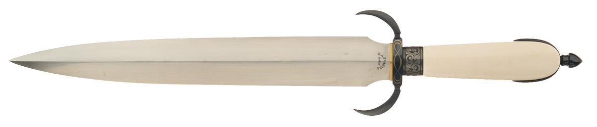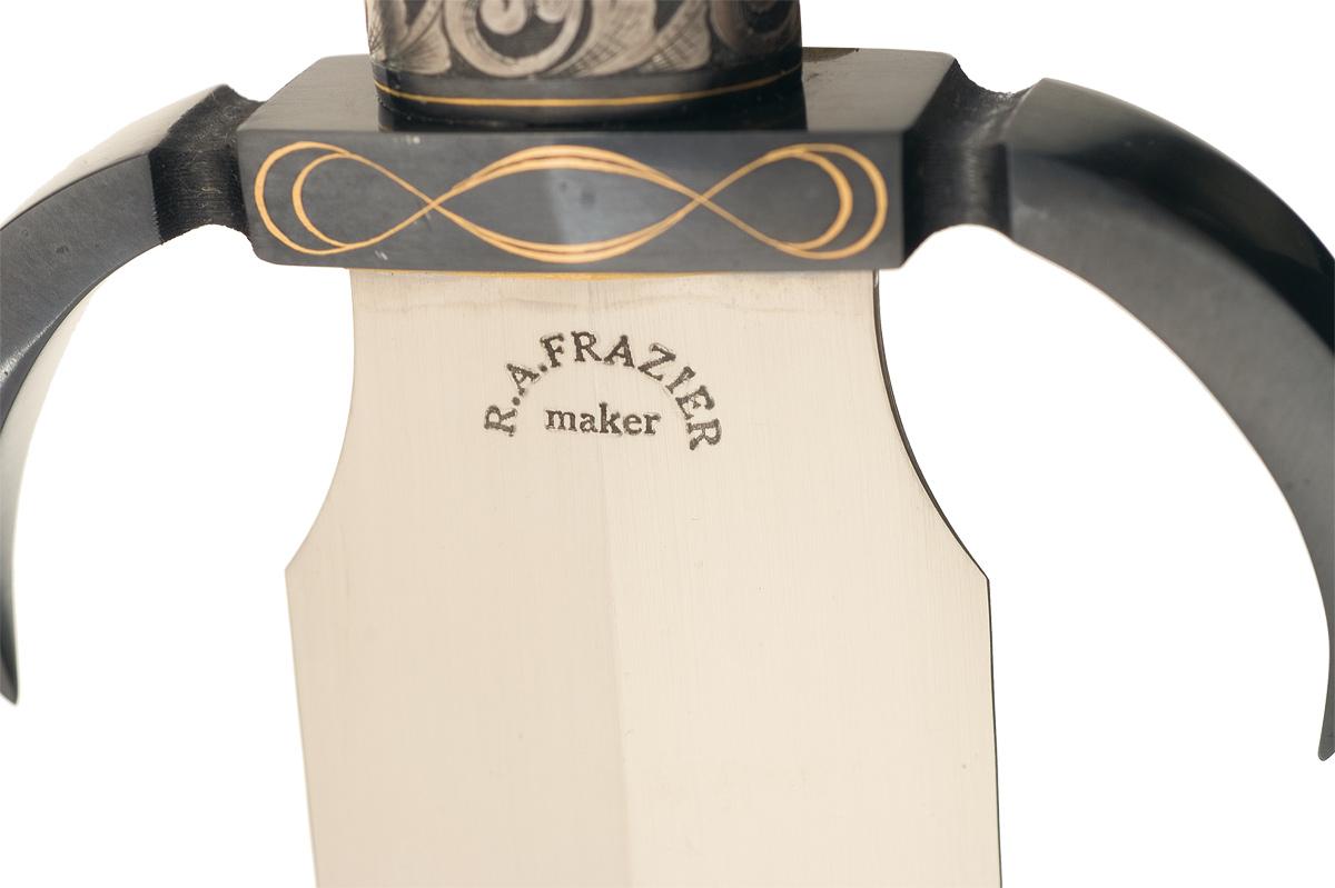 This dagger was handcrafted by Ronald A. Frazier, an award winning member of the Knifemakers' Guild for over 30 years. This Frazier dagger features an 11 1/2 inch blade marked "R.A. FRAZIER / maker". Blue finished fittings with turned down guard. The spacer between the guard and handle and the extended pommel base, which wraps around the butt of the handle, feature a scroll engraving (left in the white) on a fine punch dot background with thin gold inlaid borders. The guard has a gold inlaid twisted line pattern and is marked with the engraver's initial's, "T.D." OAL: 17".