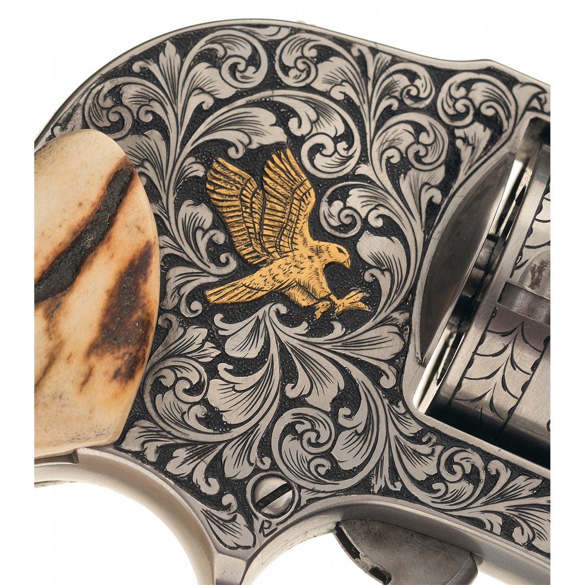 Manufactured in 1999. Has extensive floral scroll engraving on the sides of the frame and barrel with flourishes between the flutes on the cylinder. There is a gold inlaid eagle's head on the left side of the frame and a gold inlaid eagle with talons outstretched on the right side. Fitted with a pair of stag grips.