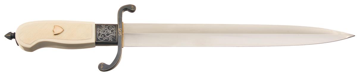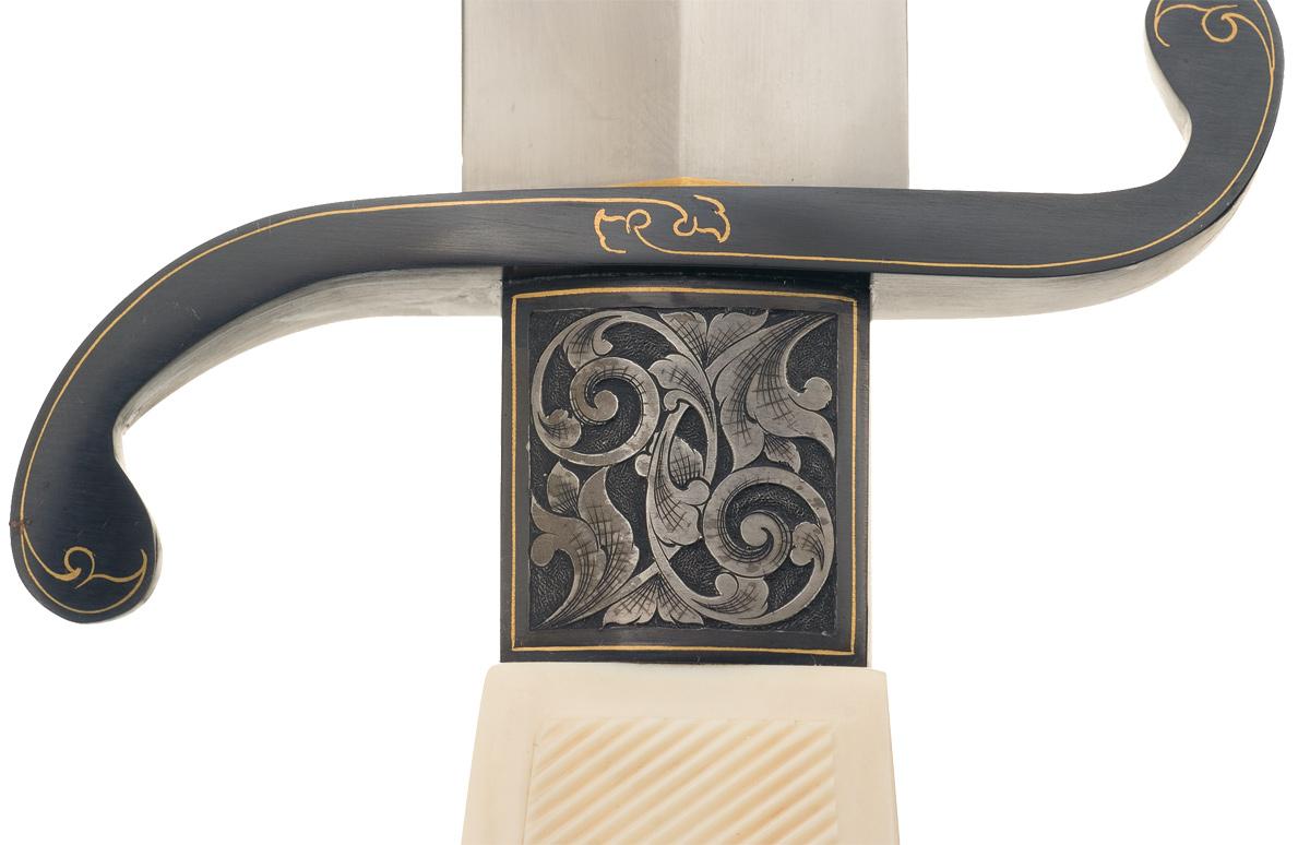 Handcrafted by award winning member of the Knifemakers' Guild Ronald A. Frazier, this dagger features an 11 1/2 inch blade marked "R.A. FRAZIER / maker". Floral scroll engraved and gold inlaid hilt, with serrated ivory handle adorned with a shield on either side. Blued fittings with polished blade. OAL: 16 1/2"
