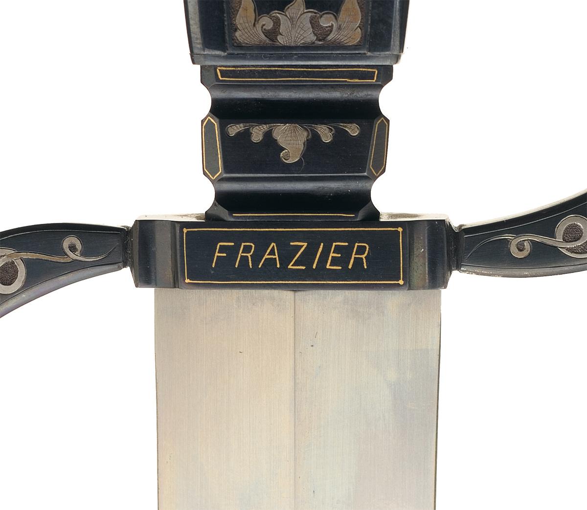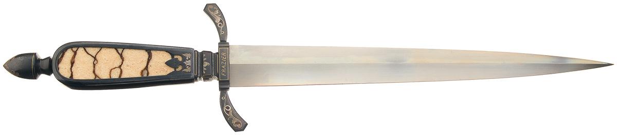This dagger was handcrafted by Ronald A. Frazier. Frazier is an award winning member of the Knifemakers' Guild for over 30 years. This Frazier dagger has a 10 1/4 inch blade, an "S" shaped guard, with the fitting blued. "FRAZIER" is inlaid and outlined in gold. The hilt has silver floral scroll and gold border inlays with a stone panel. OAL: 16"