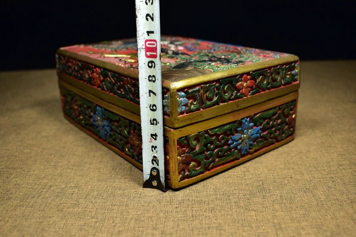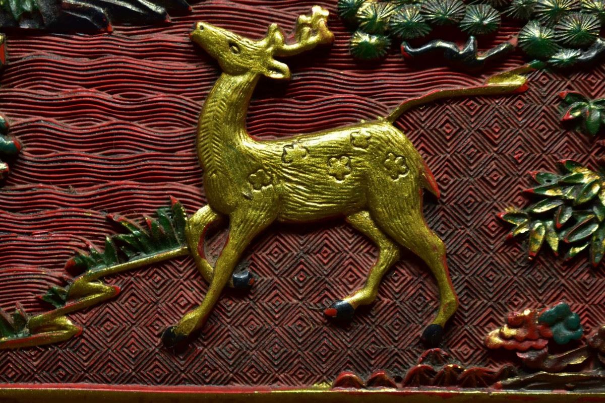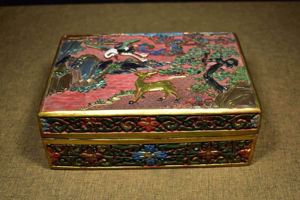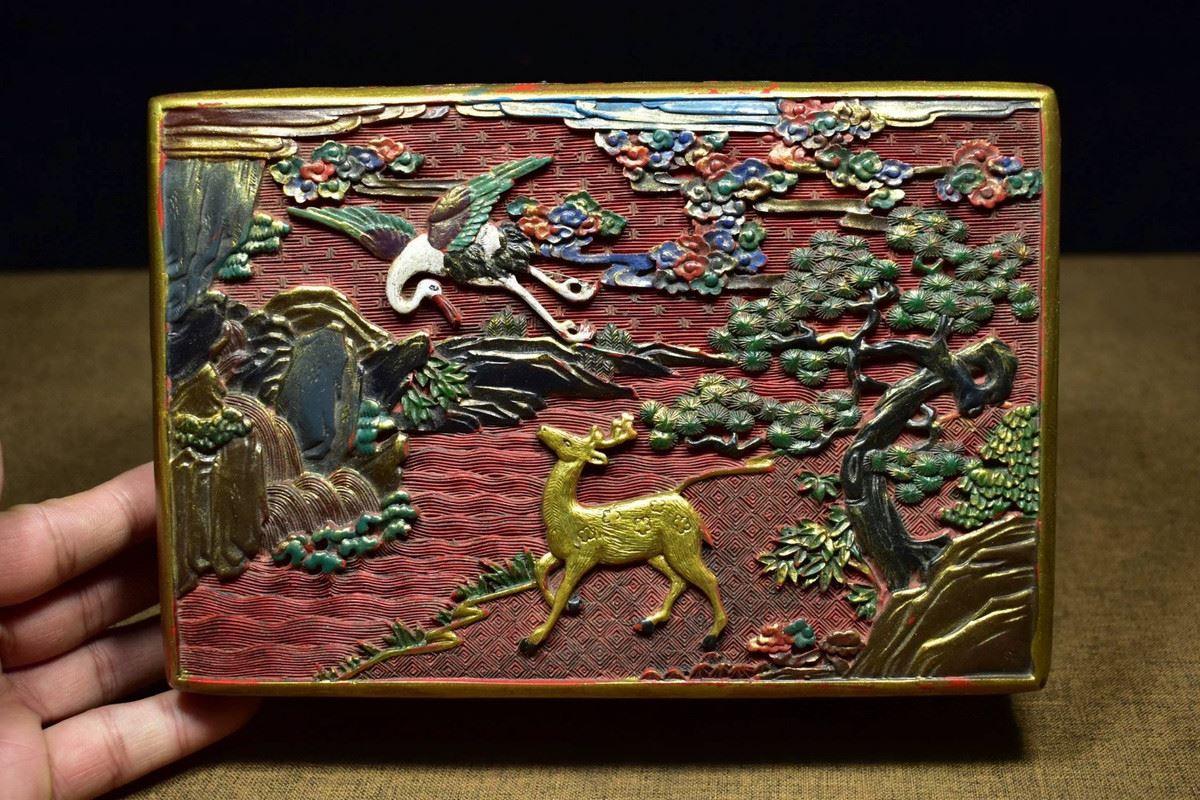 This box features a red ground, finely engraved and painted with landscapes, trees, and flowers in a vivid and three-dimensional style. A crane is depicted soaring in the sky while a deer strolls gracefully below, accompanied by tall pines—an auspicious scene symbolizing longevity and prosperity, often referred to as “Cranes and Deer of Eternal Spring.” The bold colors and intricate craftsmanship blend natural beauty with cultural symbolism, making this piece both functional and an exquisite artifact of artistic and collectible value.
