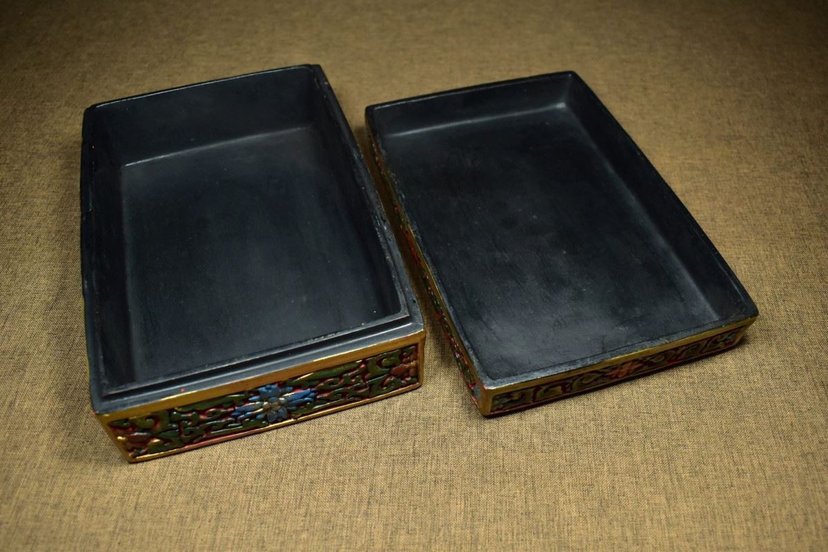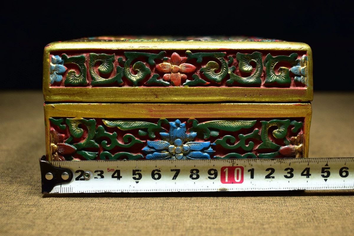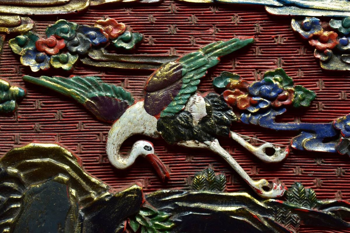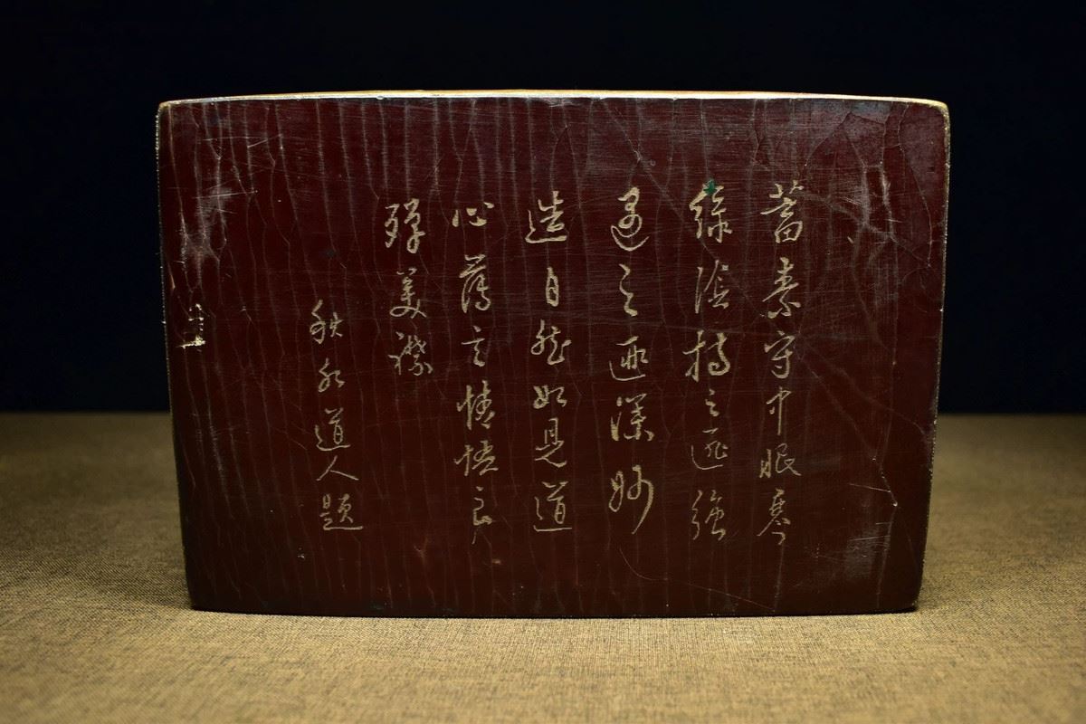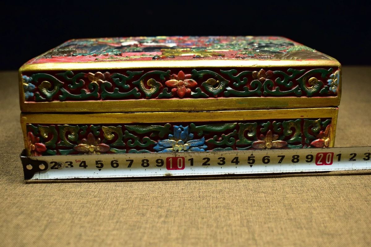 This box features a red ground, finely engraved and painted with landscapes, trees, and flowers in a vivid and three-dimensional style. A crane is depicted soaring in the sky while a deer strolls gracefully below, accompanied by tall pines—an auspicious scene symbolizing longevity and prosperity, often referred to as “Cranes and Deer of Eternal Spring.” The bold colors and intricate craftsmanship blend natural beauty with cultural symbolism, making this piece both functional and an exquisite artifact of artistic and collectible value.